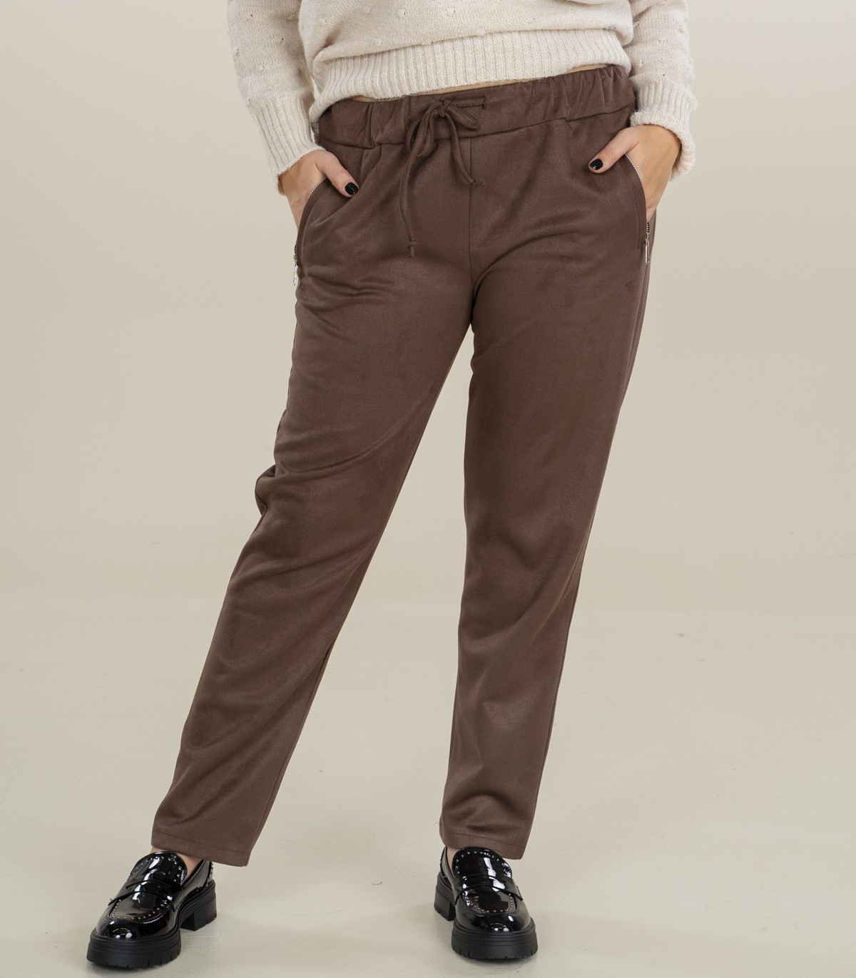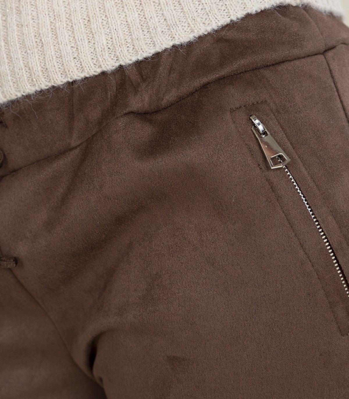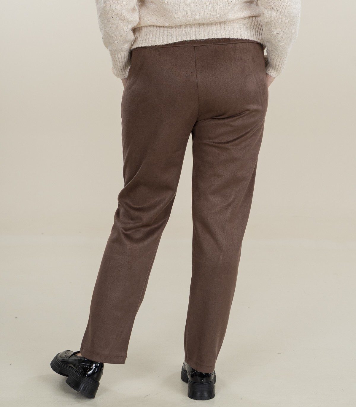 Sieviešu Zabaione bikses, kas izgatavotas no mīksta, zamšādai līdzīga materiāla. Elastīga jostasvieta ērtai piegulšanai.
