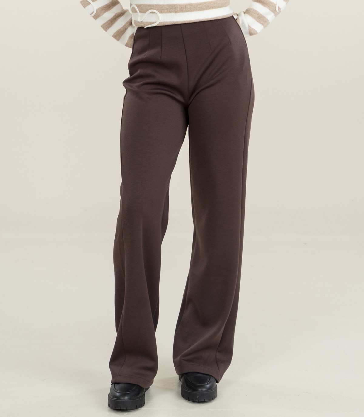 Šīs ērtās brūnās taisnās bikses ir lieliski piemērotas gan ikdienas valkāšanai, gan birojam. Elastīgā jostasvieta un mīkstais audums nodrošina ērtu piegulšanu.