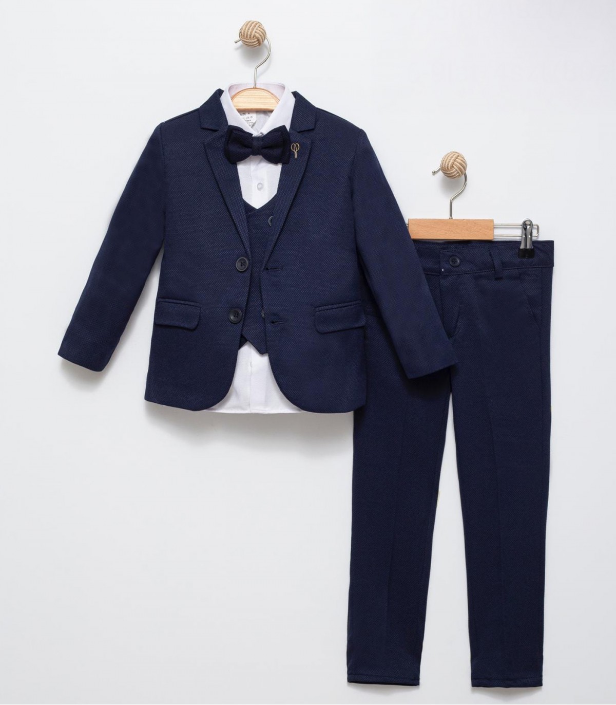 Šis klasiskais tumši zilais zēnu formālais komplekts ir lieliski piemērots īpašiem pasākumiem un svinīgiem gadījumiem. Tajā ietilpst jaka, veste, krekls, kaklasaite un bikses.