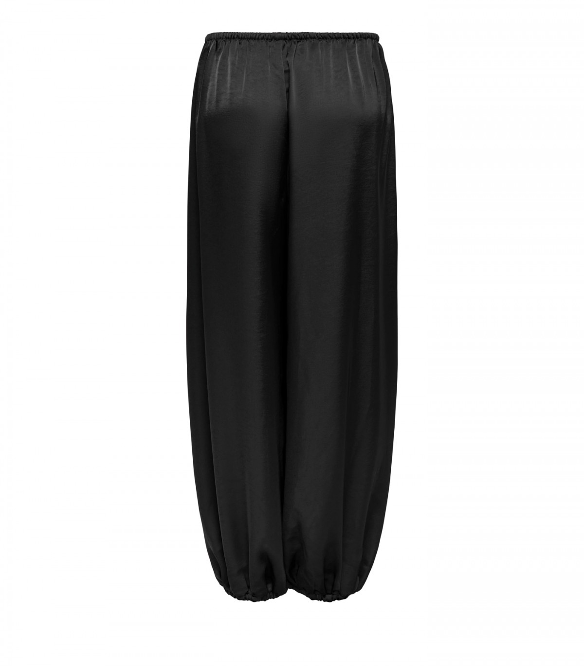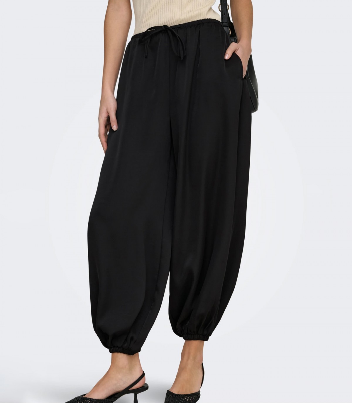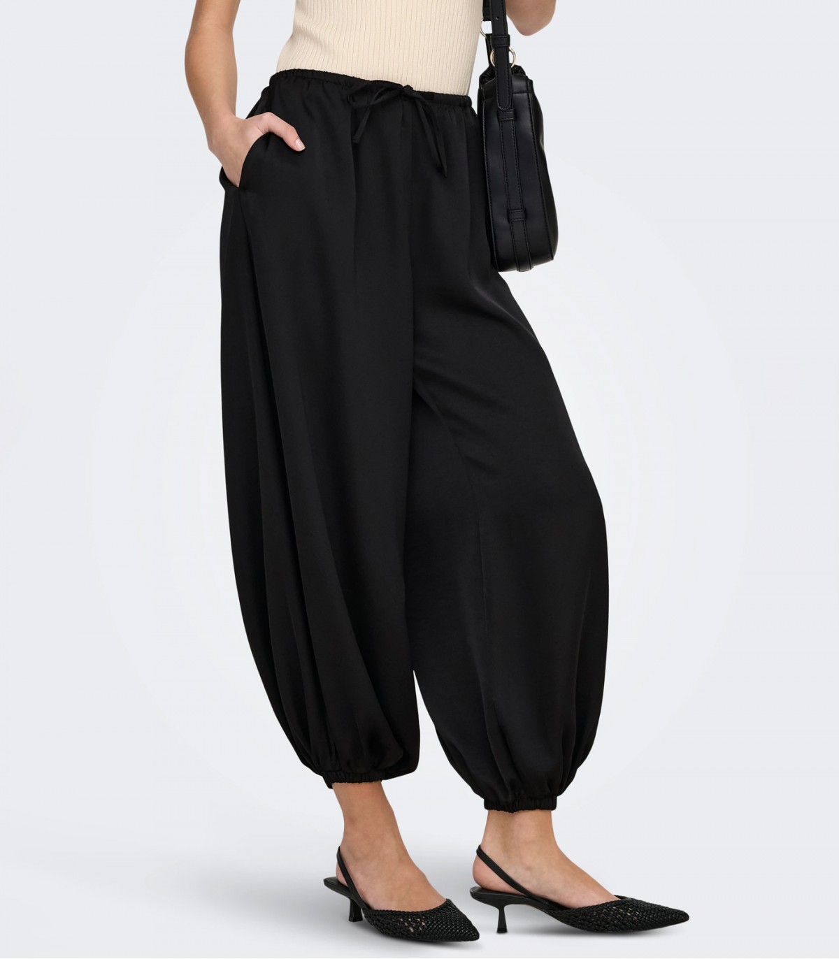 Sieviešu brīva piešuma bikses ar elastīgu jostasvietu, kas izgatavotas no mīksta, nedaudz spīdīga auduma. Elastīgas aproces apakšmalā rada apjomīgu siluetu. Lieliski piemērotas gan ikdienas valkāšanai, gan formālākam tēlam.