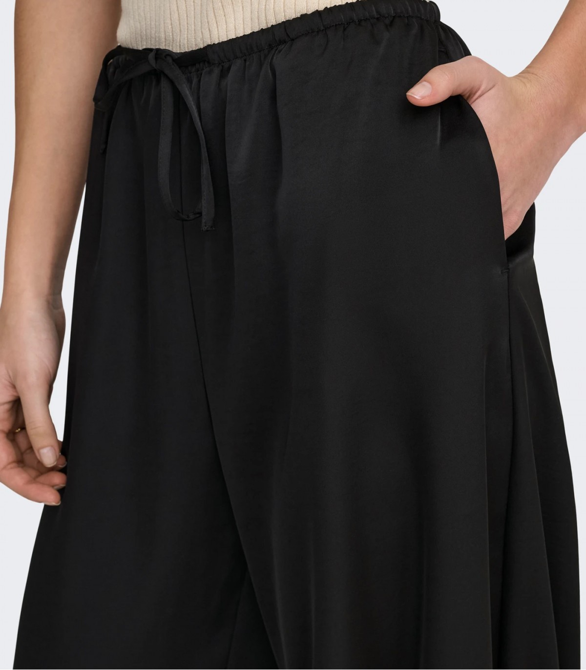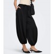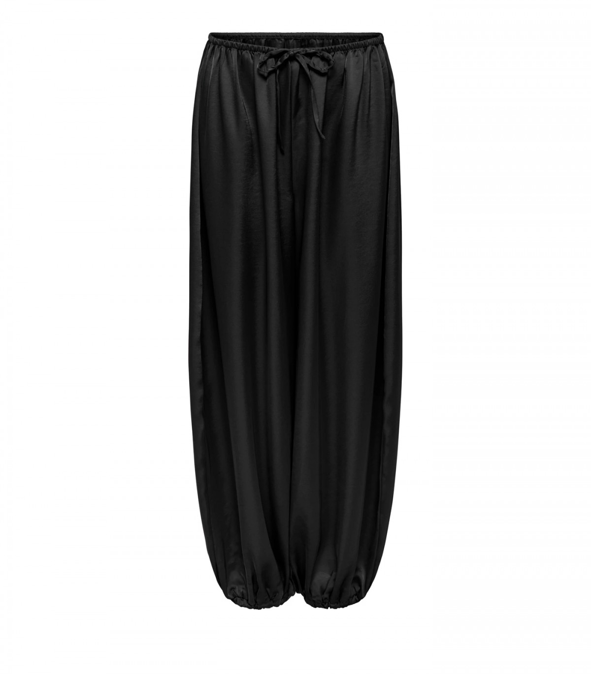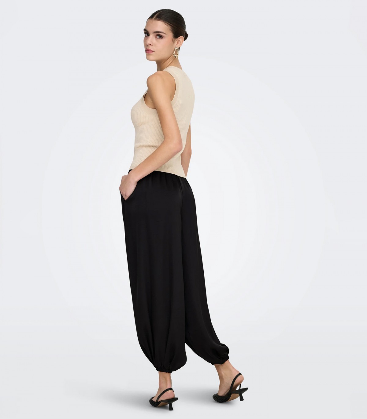 Sieviešu brīva piešuma bikses ar elastīgu jostasvietu, kas izgatavotas no mīksta, nedaudz spīdīga auduma. Elastīgas aproces apakšmalā rada apjomīgu siluetu. Lieliski piemērotas gan ikdienas valkāšanai, gan formālākam tēlam.