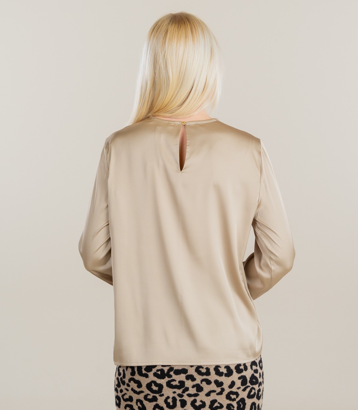 Modelim ir apaļš kakla izgriezums un pogas aizdare aizmugurē, kas nodrošina ērtu uzvilkšanu un piešķir elegantu akcentu. Vieglā un stilīgā blūze ir viegli kombinējama gan ar klasiskām biksēm un svārkiem, gan džinsiem, ļaujot radīt dažādus tēlus – no biroja līdz vakara tērpam.