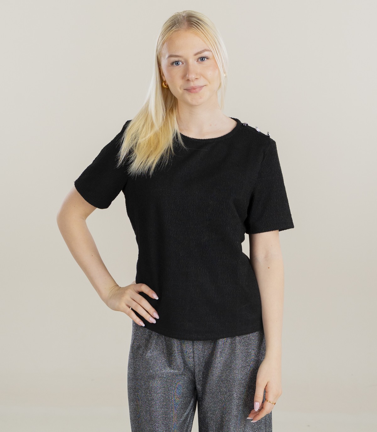 Sieviešu JDY blūze no rūtaina buklē materiāla, ar īsām piedurknēm un dekoratīvām sudraba pogām uz pleca - viegli iederēsies gan ikdienas, gan biroja tēlā.