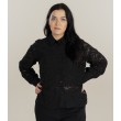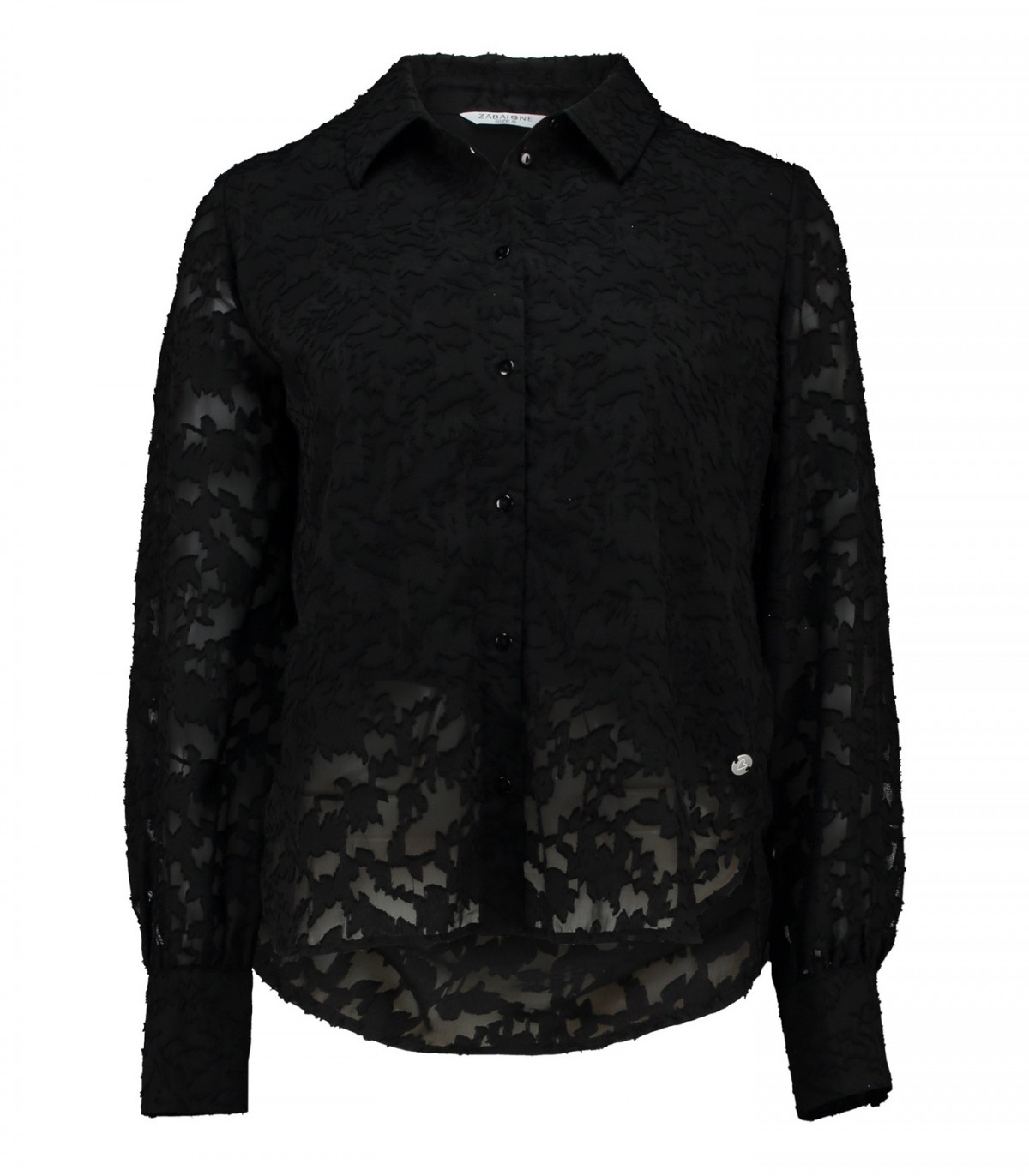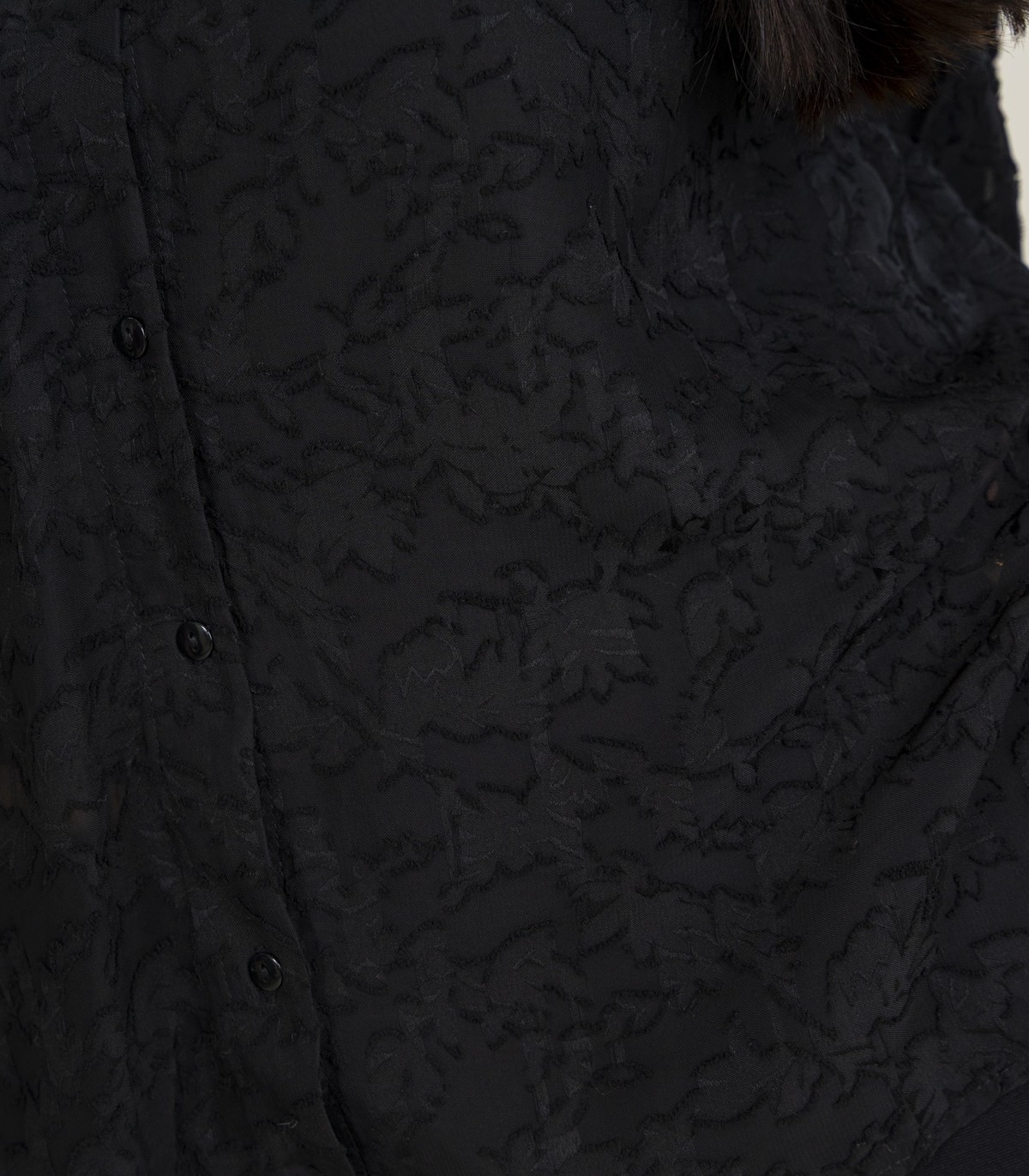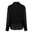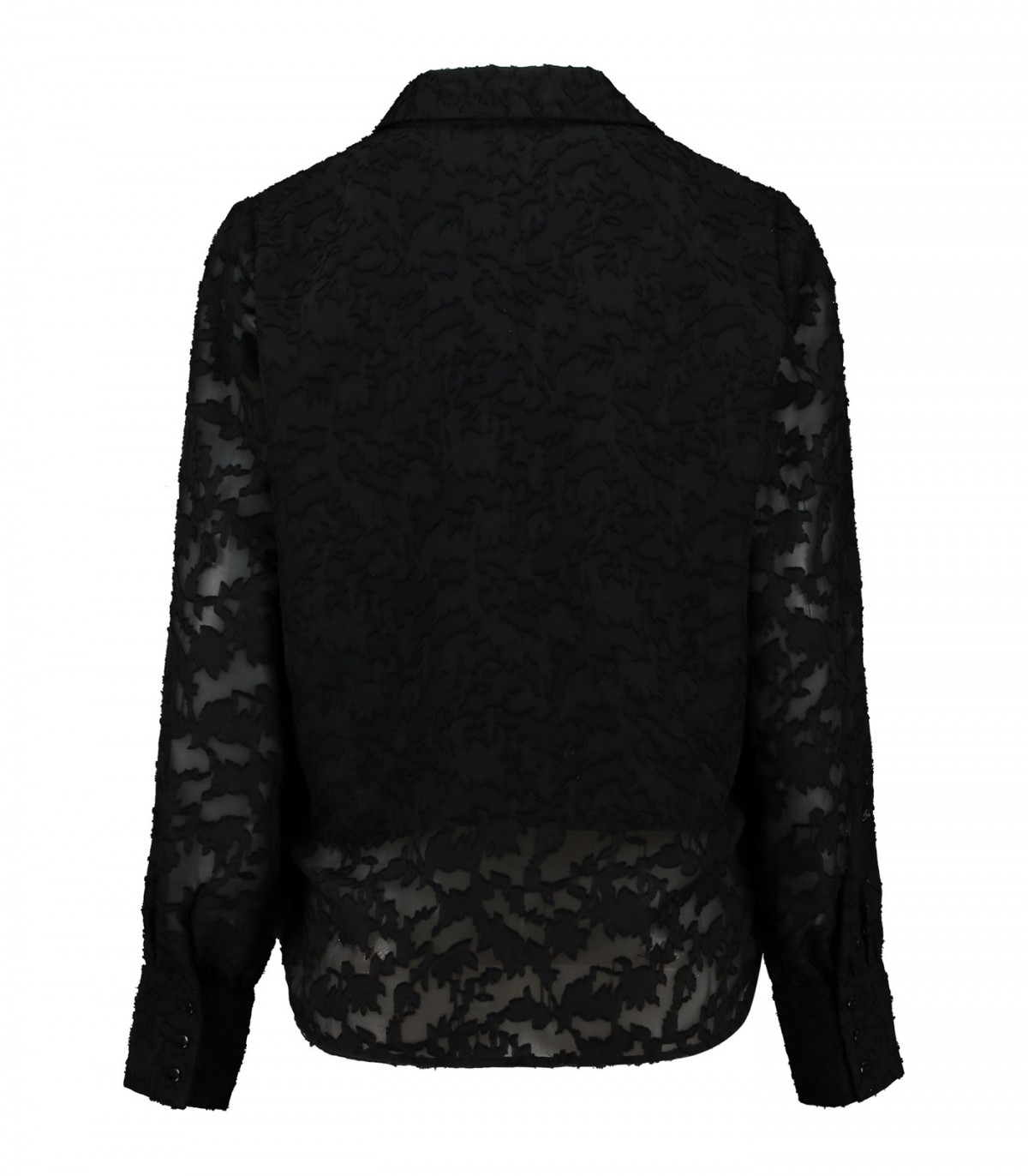 Šī puscaurspīdīgā melnā blūze ir darināta no samtaina reljefa auduma. Tās sievišķīgais piegriezums un klasiskā apkakle padara to ideāli piemērotu gan ikdienas valkāšanai, gan svinīgākiem gadījumiem.