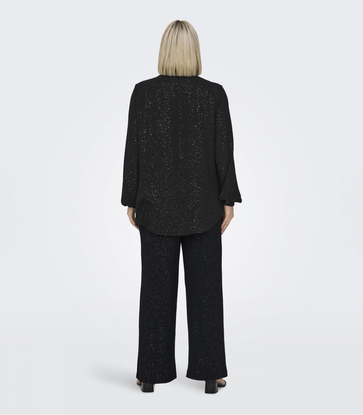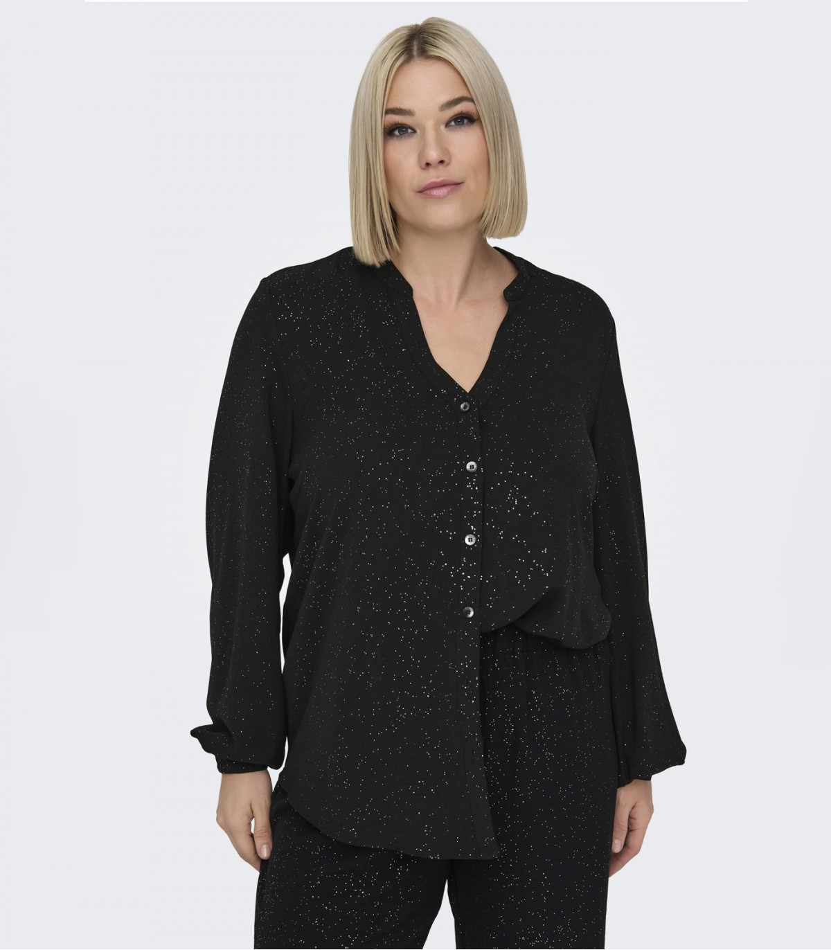 Stilīgā “Only Carmakoma” blūze ir darināta no viegla auduma ar spīdīgu apdari viscaur, radot izsmalcinātu un svētku izskatu. V veida kakla izgriezums un ķīniešu apkakle apvieno eleganci un komfortu, savukārt nolaistie pleci piešķir maigu siluetu.