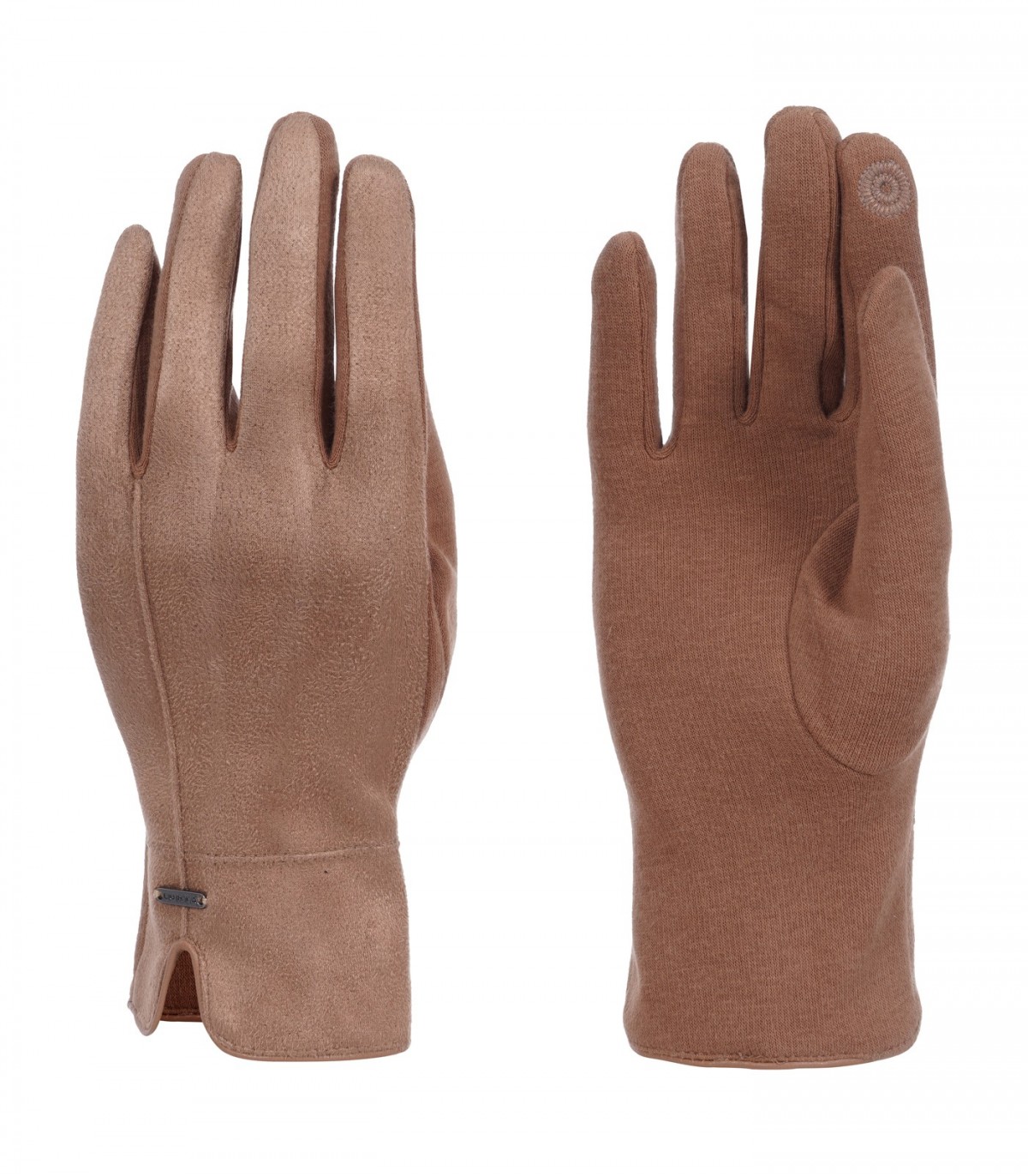 Luhta sieviešu cimdi ar metāla logotipu un apmali gar malu.