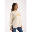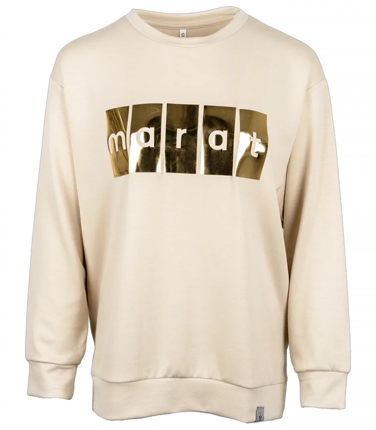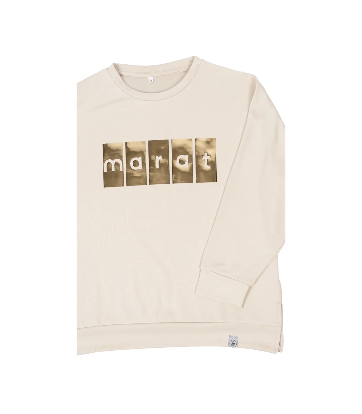 Šī bēšā sieviešu sporta krekls ar zelta logotipa apdruku ir košs un stilīgs. Piešķiriet savai garderobei mirdzumu ar šo bēšo Marat sporta kreklu ar izteiksmīgu zelta logotipa apdruku.