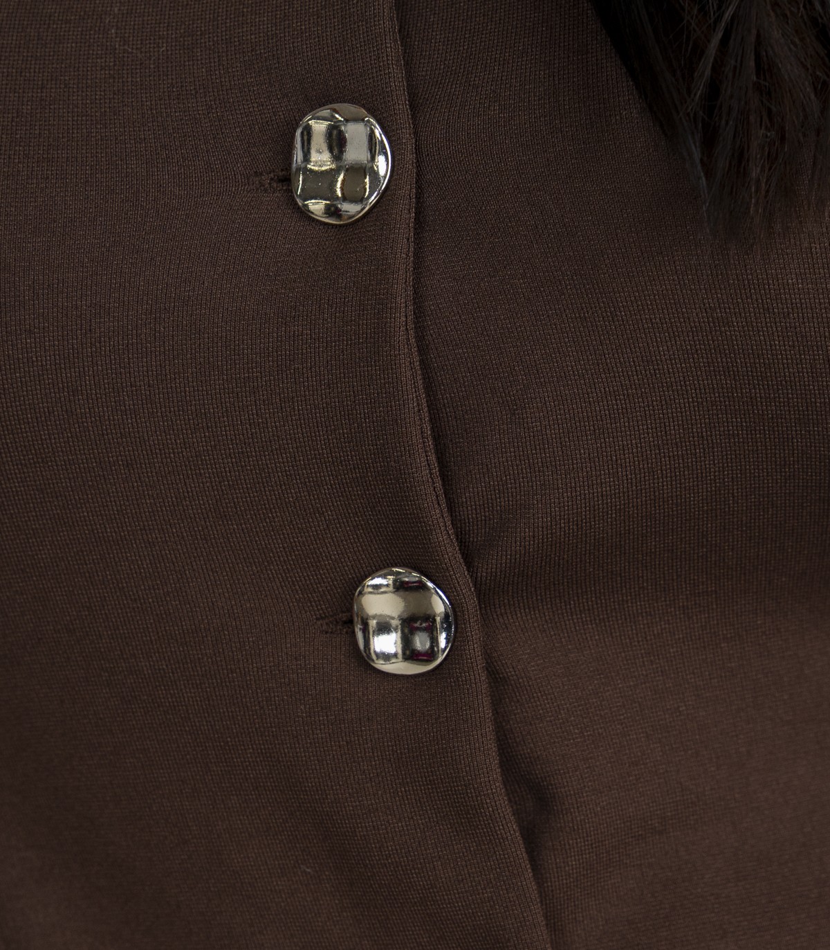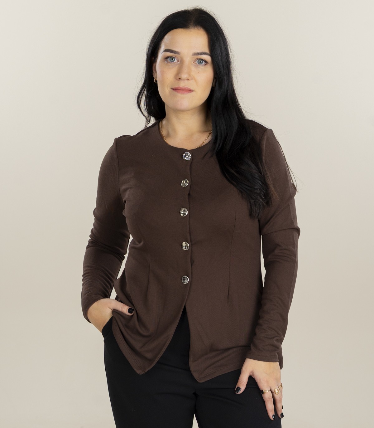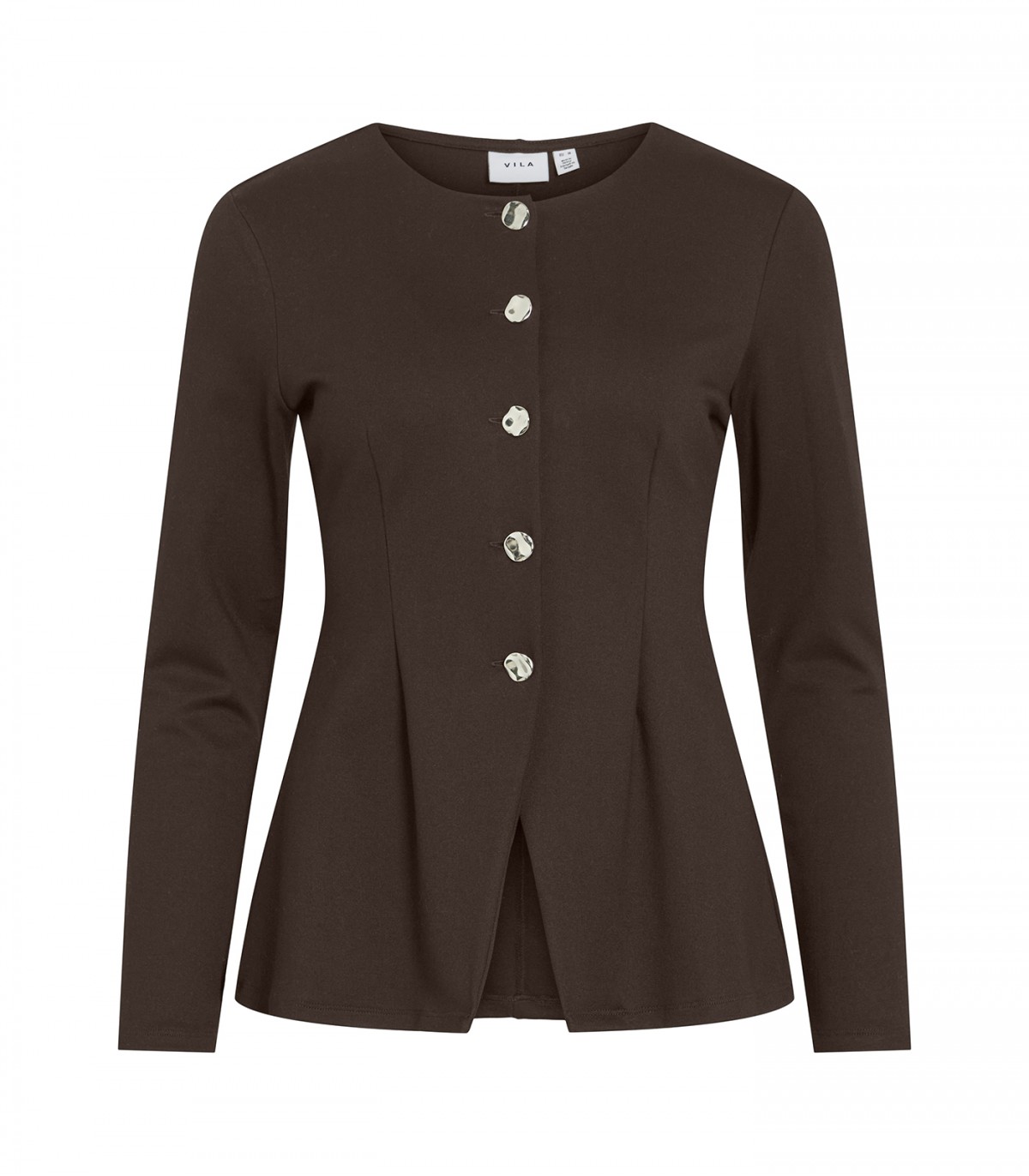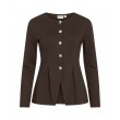 Šī klasiskā piegriezuma melnā jaka ar kontrastējošām pogām ir ideāli piemērota gan darbam, gan oficiāliem pasākumiem.