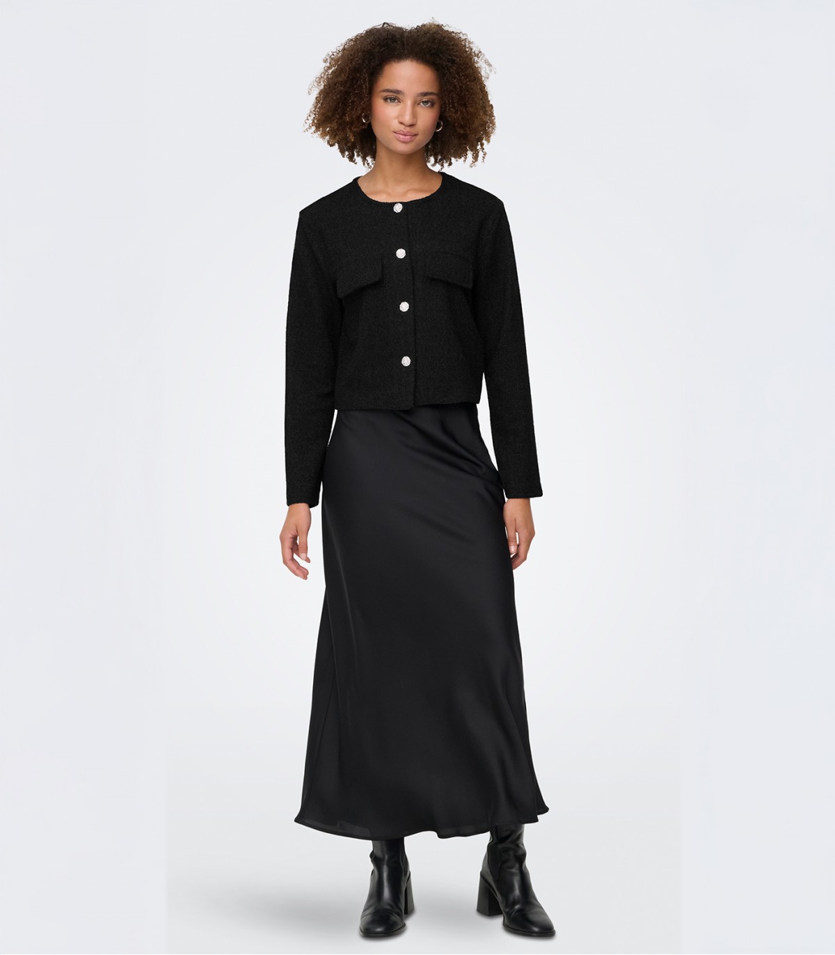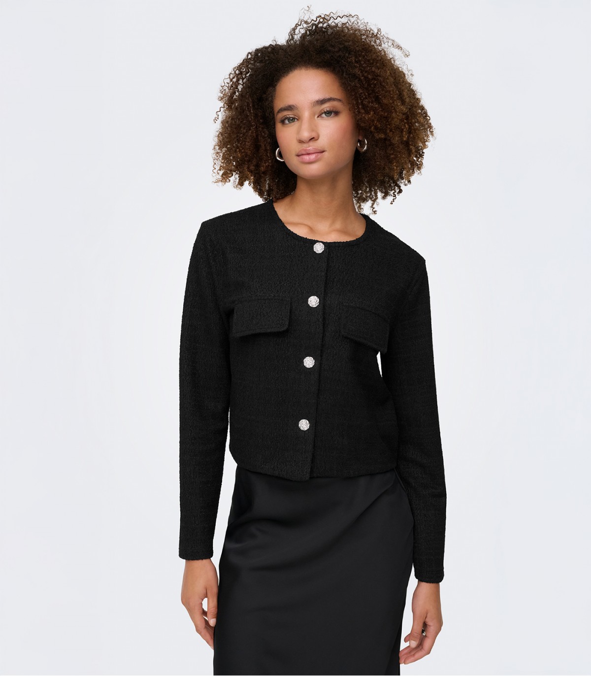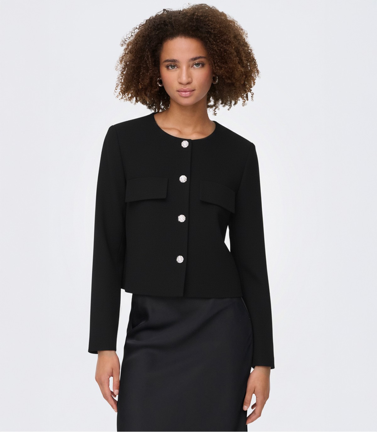 JDY īsā sieviešu jaka ir lieliski piemērota gan oficiāliem pasākumiem, gan ikdienas valkāšanai. Strukturētais audums un dekoratīvās pogas piešķir tai klasisku, bet modernu izskatu.