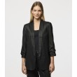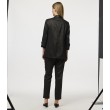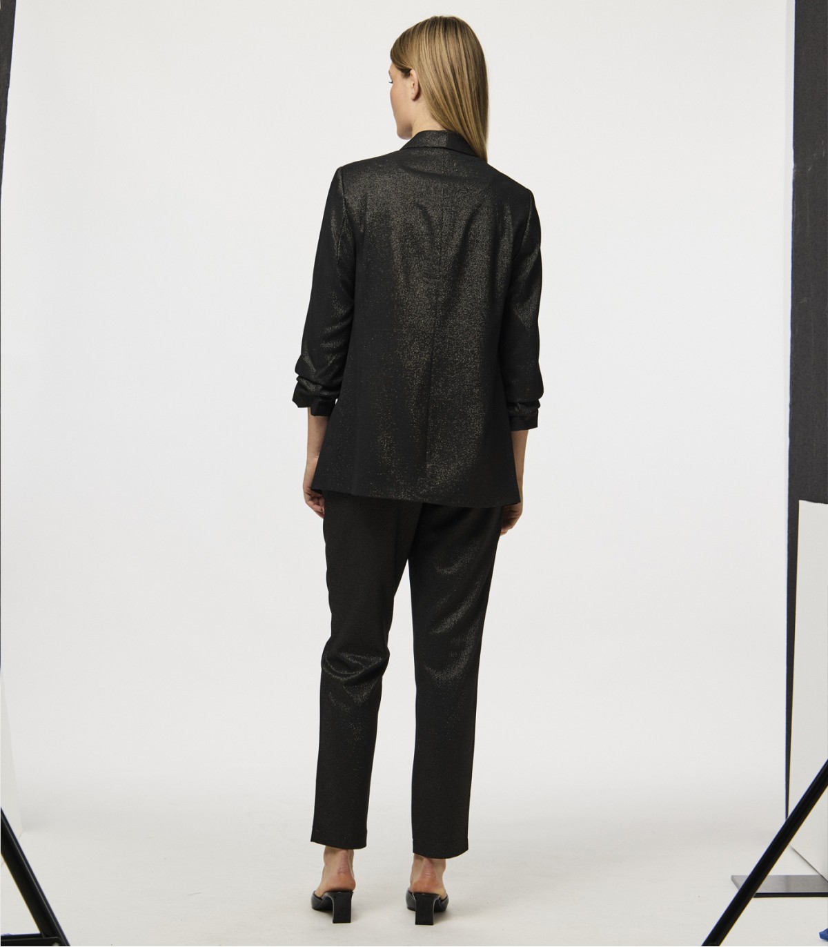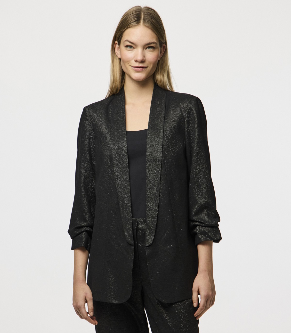 Klasiska melna žakete no spīdīga auduma. Taisna piegriezuma, ar apkakli un uzlocītām piedurknēm. Piemērota gan ikdienai, gan svinīgiem pasākumiem.