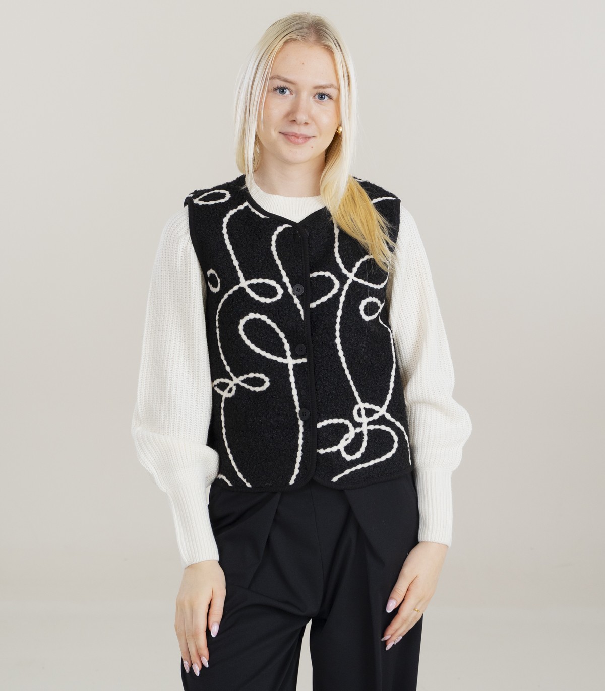 Melna veste ar baltām dekoratīvām līnijām. Tai ir taisns piegriezums un pogu aizdare priekšpusē, tāpēc tā ir ideāli piemērota slāņošanai — valkājama gan ar blūzi, gan džemperi.