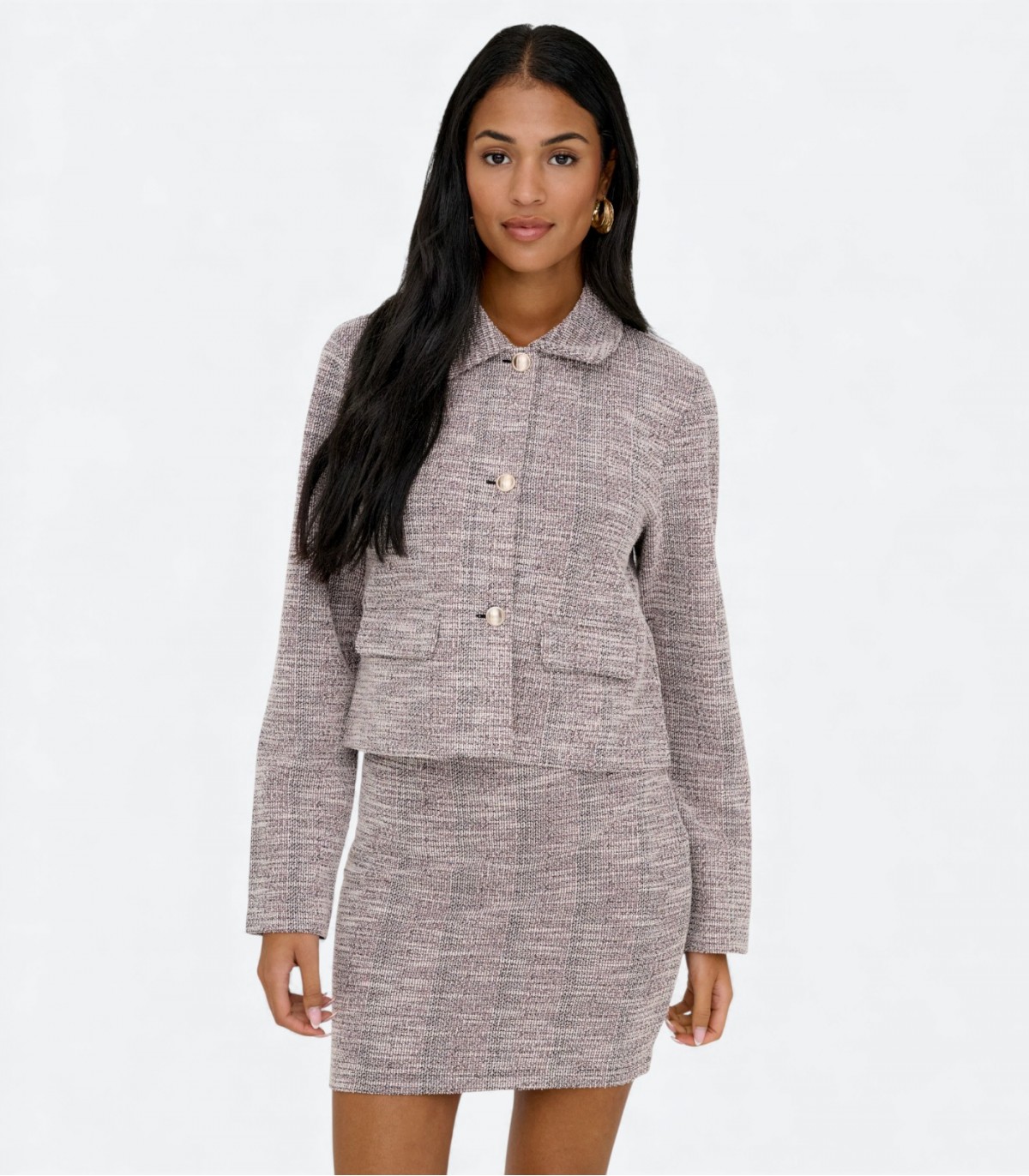 Klasiska piegriezuma sieviešu žakete ar apkakli un pogu aizdari. Taisnais, nedaudz īsais siluets piešķir žaketei sievišķīgu un modernu izskatu. Piemērota gan birojam, gan ikdienas valkāšanai.