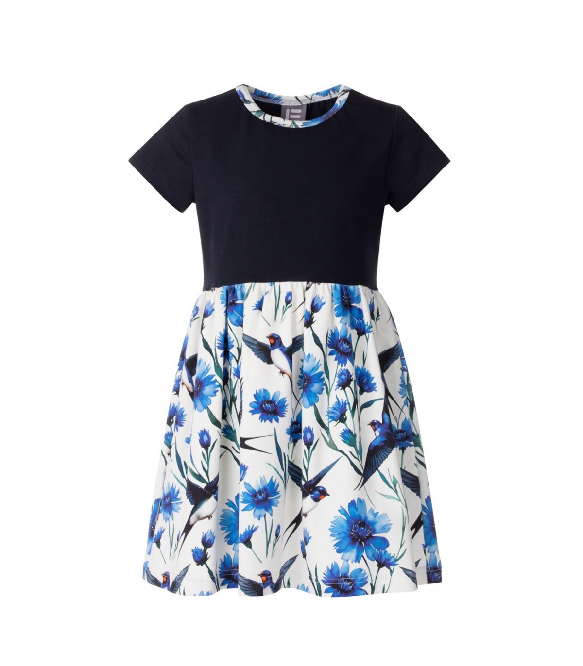 Šī īsroku kokvilnas kleita ir ērta un praktiska gan ikdienas valkāšanai, gan svinīgākiem gadījumiem. Tā ir izgatavota no ādai draudzīga un droša kokvilnas auduma, kas sertificēts atbilstoši Oeko-Tex Standard 100. Vienkrāsainais augšdaļa un rakstainie svārki rada skaistu kontrastu, piešķirot kleitai īpašu šarmu.