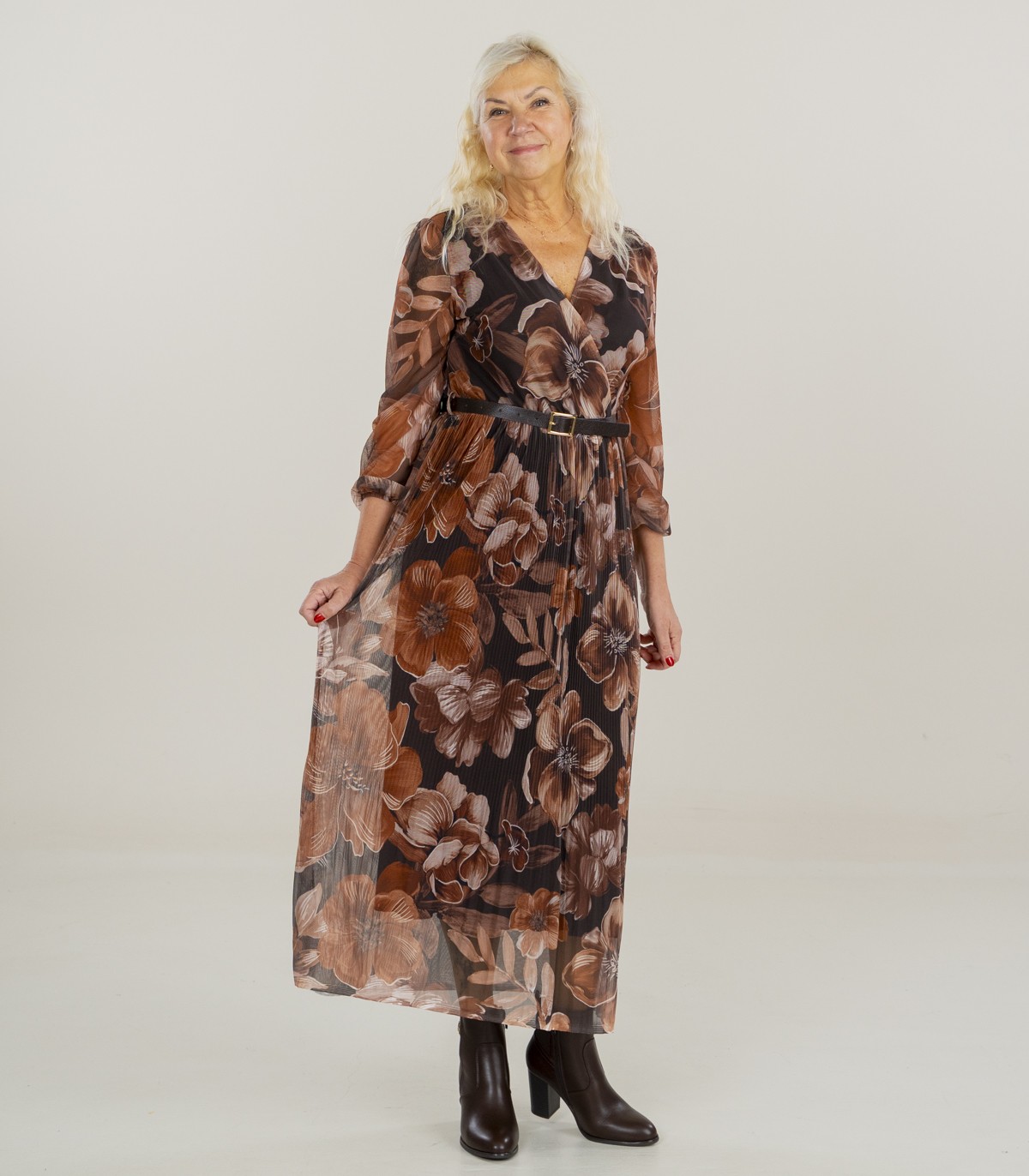Šī elegantā, garā Zabaione kleita ir izsmalcināta izvēle gan īpašiem gadījumiem, gan ikdienas valkāšanai. Tā ir veidota, uzsverot sievišķību un komfortu, un garās, puscaurspīdīgās piedurknes ir apdarinātas ar mīkstām gumijām, radot vieglu un gaisīgu efektu.