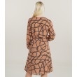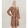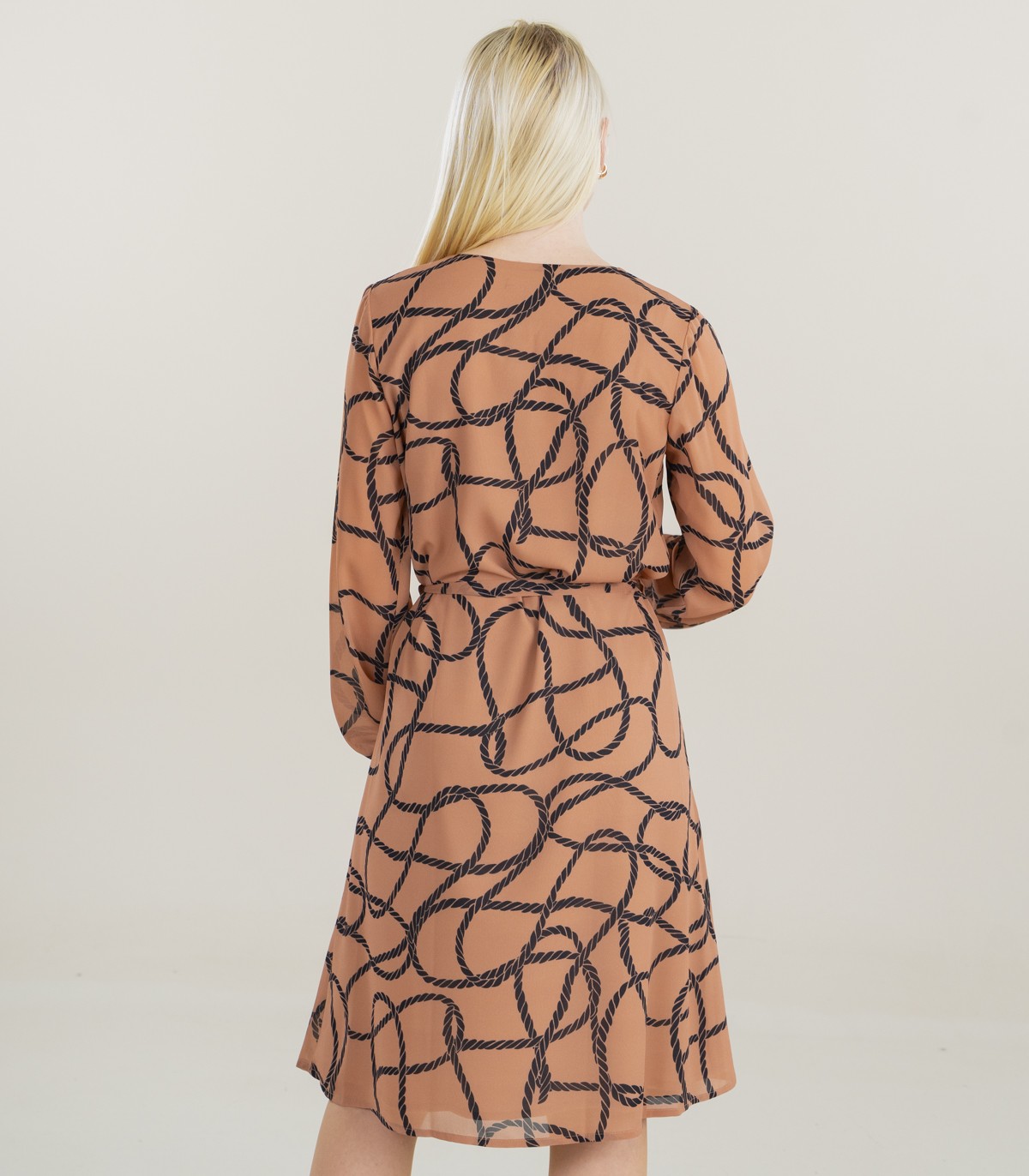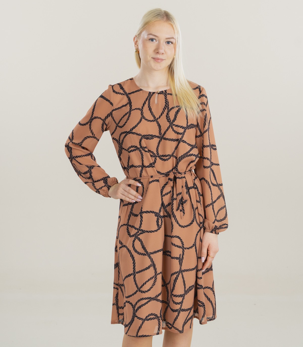 Šī elegantā Denim Dream kleita ir radīta tiem, kas novērtē komfortu un stilu. Bēšais fons ar kontrastējošu virvju apdruku piešķir šim apģērba gabalam unikālu un pārsteidzošu izskatu. Garas, ar aprocēm aizdarītas piedurknes rada izsmalcinātu siluetu, un jostasvieta izceļ figūru. Vieglais, plūstošais audums nodrošina ērtu piegulšanu un kustību brīvību. Šī kleita ir ideāli piemērota gan ikdienas valkāšanai, gan īpašiem gadījumiem.