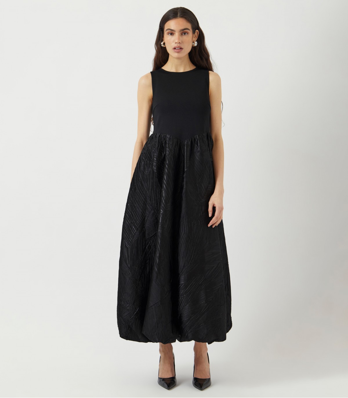 Eleganta melna kleita ar vienkāršu augšdaļu un unikālu, nedaudz mirdzošu svārku daļu. Šai garā garuma kleitai ir klasisks piegriezums, kas ir lieliski piemērots gan oficiāliem pasākumiem, gan vakara ballītēm. Audums skaisti krīt pāri figūrai, radot gaisīgu, bet izsmalcinātu siluetu kustībā.