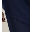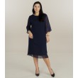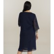 Šī tumši zilā šifona kleita ir ar sievišķīgu asimetrisku piegriezumu. Tai ir caurspīdīgas ¾ piedurknes un daudzslāņaina apakšmala, kas piešķir kleitai gaisīguma un elegances pieskārienu. Taisnais piegriezums ir lieliski piemērots gan oficiāliem pasākumiem, gan vakartērpiem.
