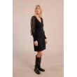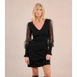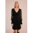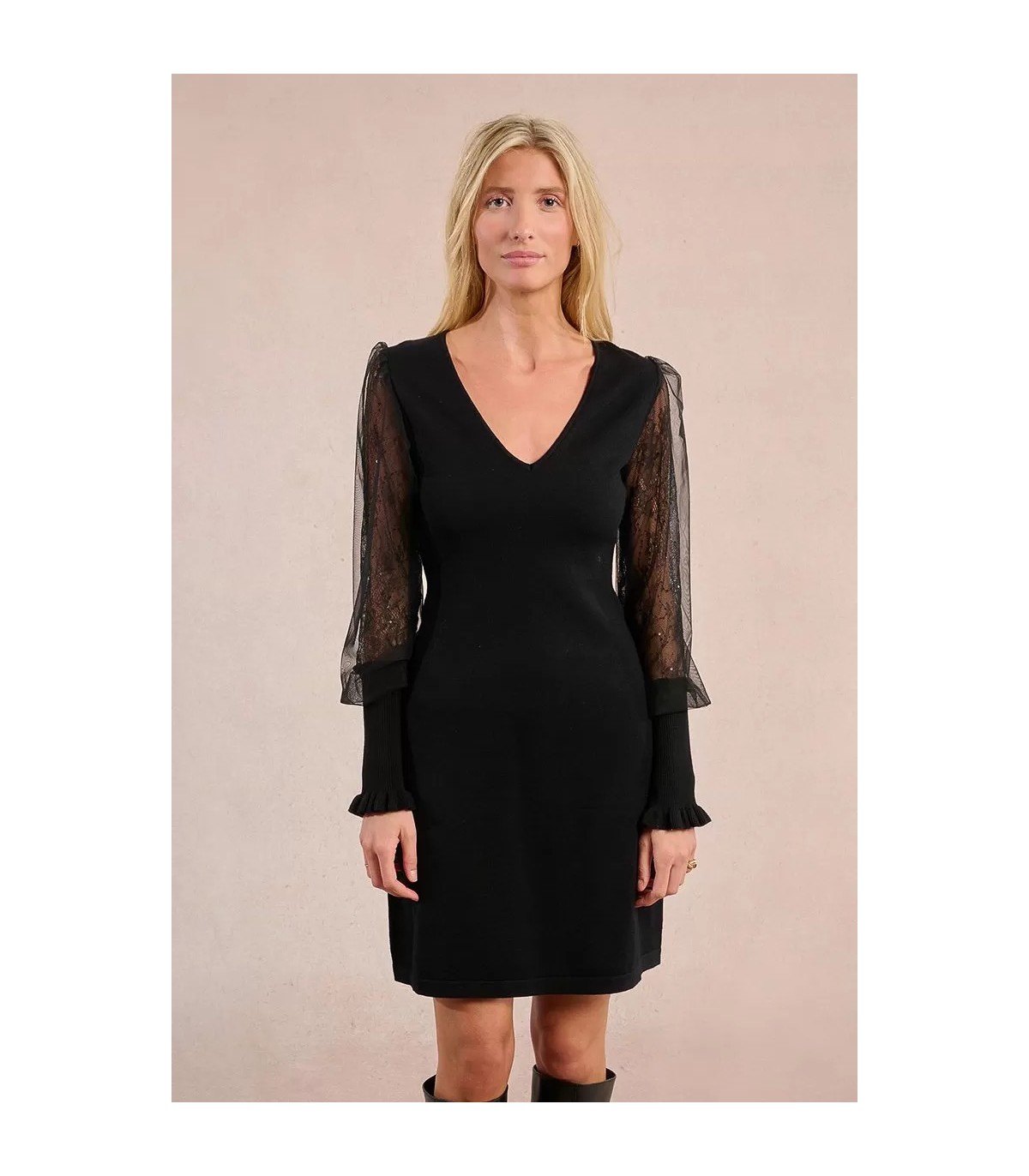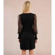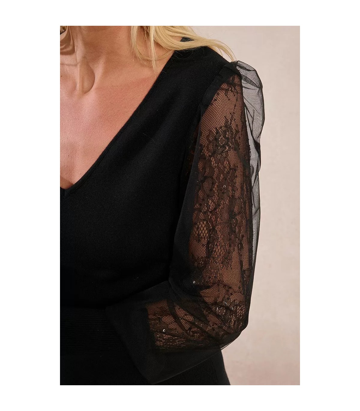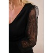 Šī elegantā melnā kleita ar garām piedurknēm, kas izgatavota no mežģīnēm, sietiņa un trikotāžas, rada sievišķīgu un stilīgu izskatu. Tās V veida kakla izgriezums, platas, elastīgas aproces un pieguļoša jostasvieta izceļ figūru. Lieliski piemērota vakara apģērbam un īpašiem gadījumiem.