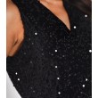 Šī īsā kleita ar fliteriem rada mirdzošu un izteiksmīgu izskatu. Tā ir bez piedurknēm, un apkakle ar apkakli izceļ kakla izgriezumu. Pieguļošs piegriezums, mini garums un dziļi izgriezta kakla izgriezuma daļa piešķir sievišķīgu un elegantu pieskārienu, padarot to ideāli piemērotu īpašiem gadījumiem un ballītēm.