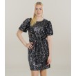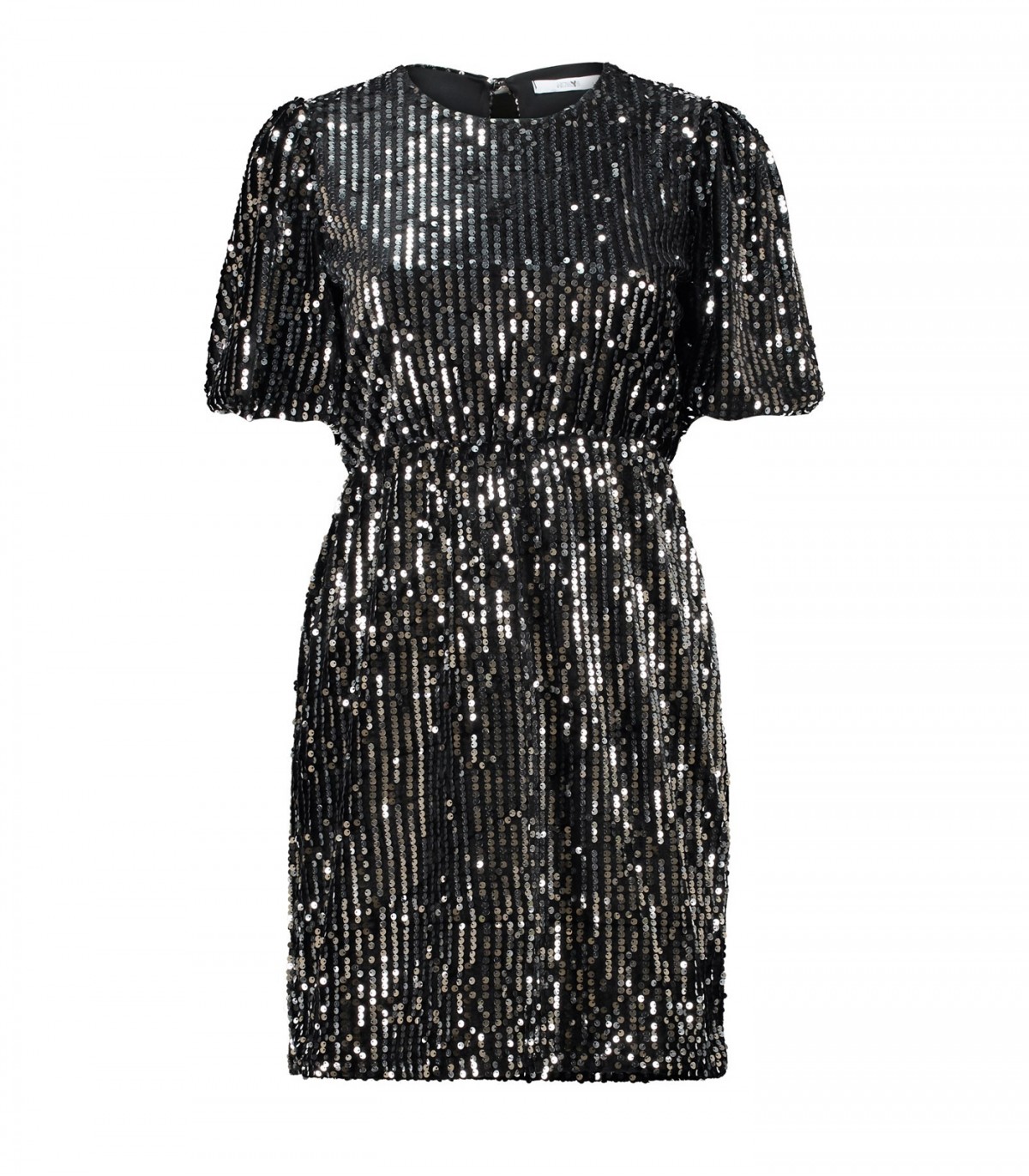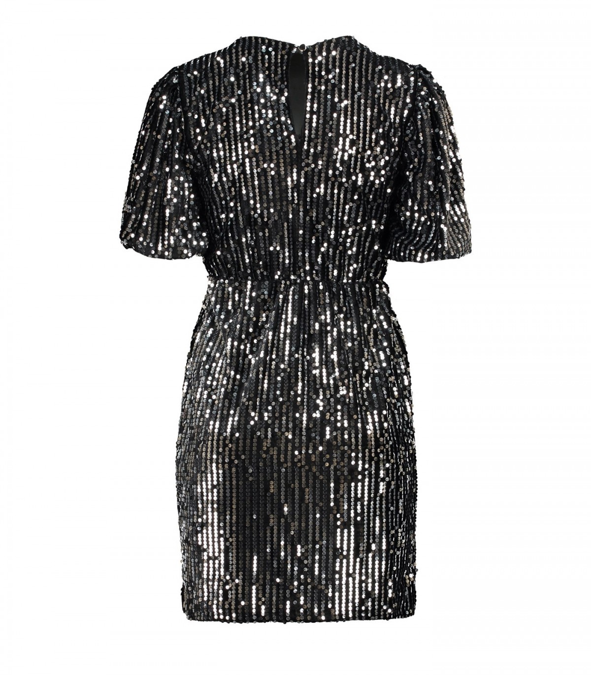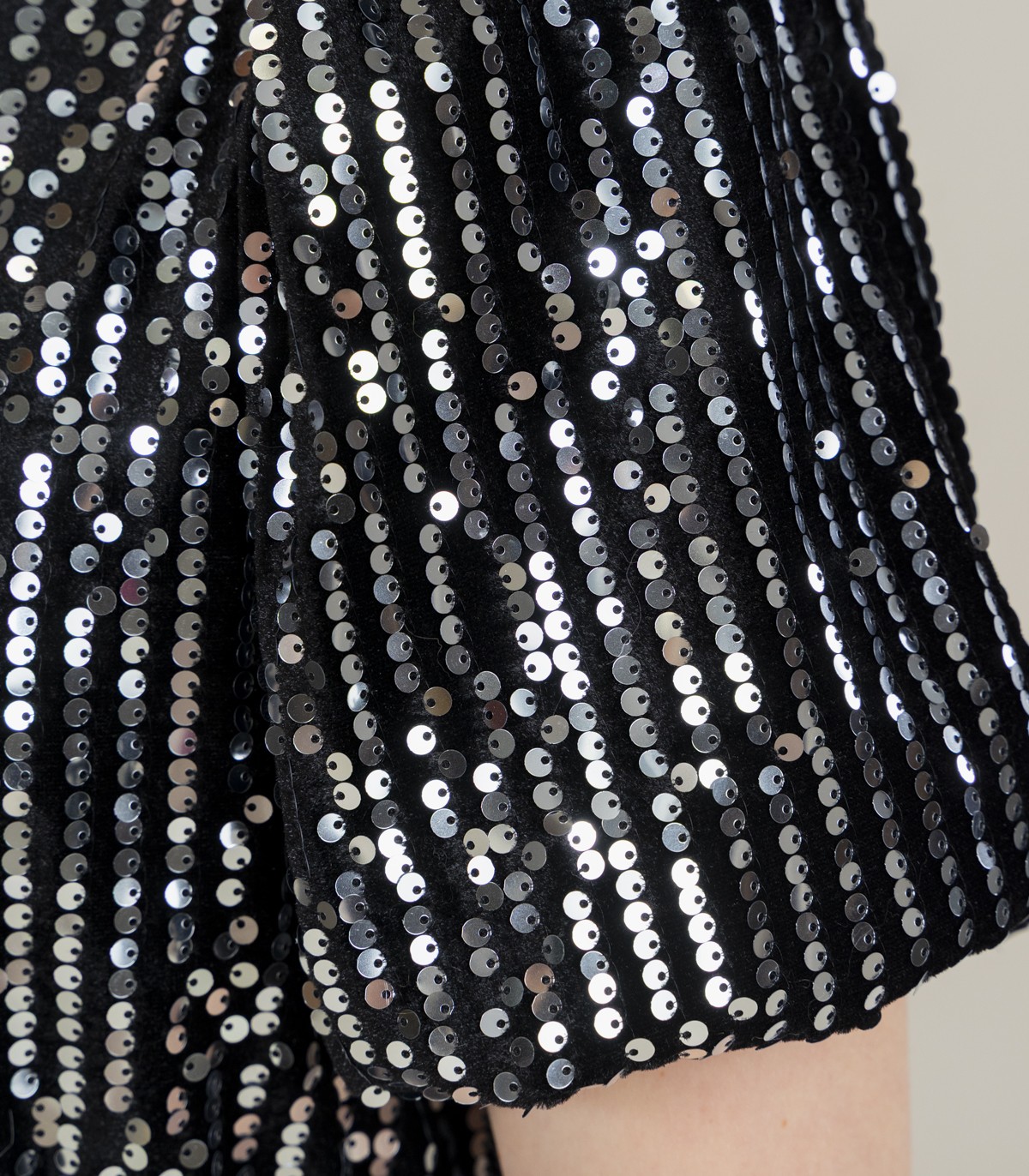 Šai mirdzošajai kleitai ir īsas piedurknes, kas izšūtas ar sīkiem fliteriem. Tai ir apaļš kakla izgriezums un elastīga jostasvieta, kas izceļ sievišķīgu siluetu. Lieliski piemērota gan svinīgiem gadījumiem, gan vakara pasākumiem.