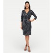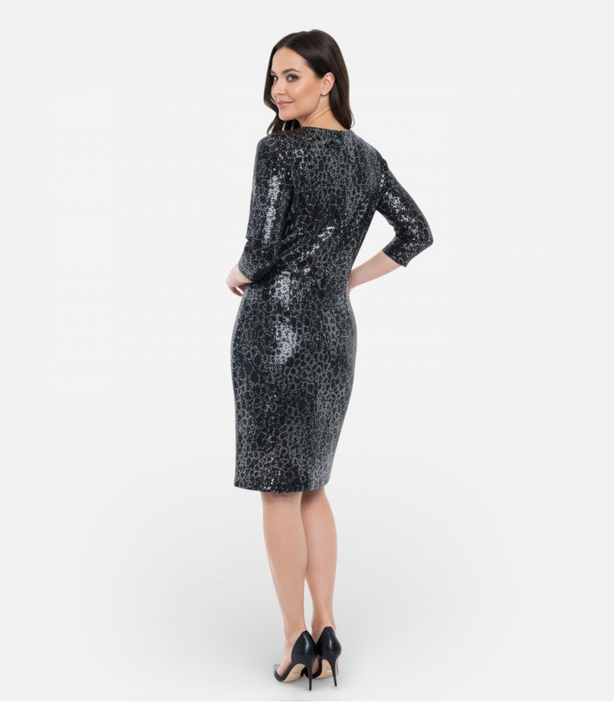 Mirdzoša kleita ar mirdzošu sudraba rakstu. V veida kakla izgriezums un rūtainais raksts izceļ sievišķīgo siluetu. Trīs ceturtdaļu piedurknes un garums līdz ceļiem ir lieliski piemērotas gan oficiāliem pasākumiem, gan vakara pasākumiem.