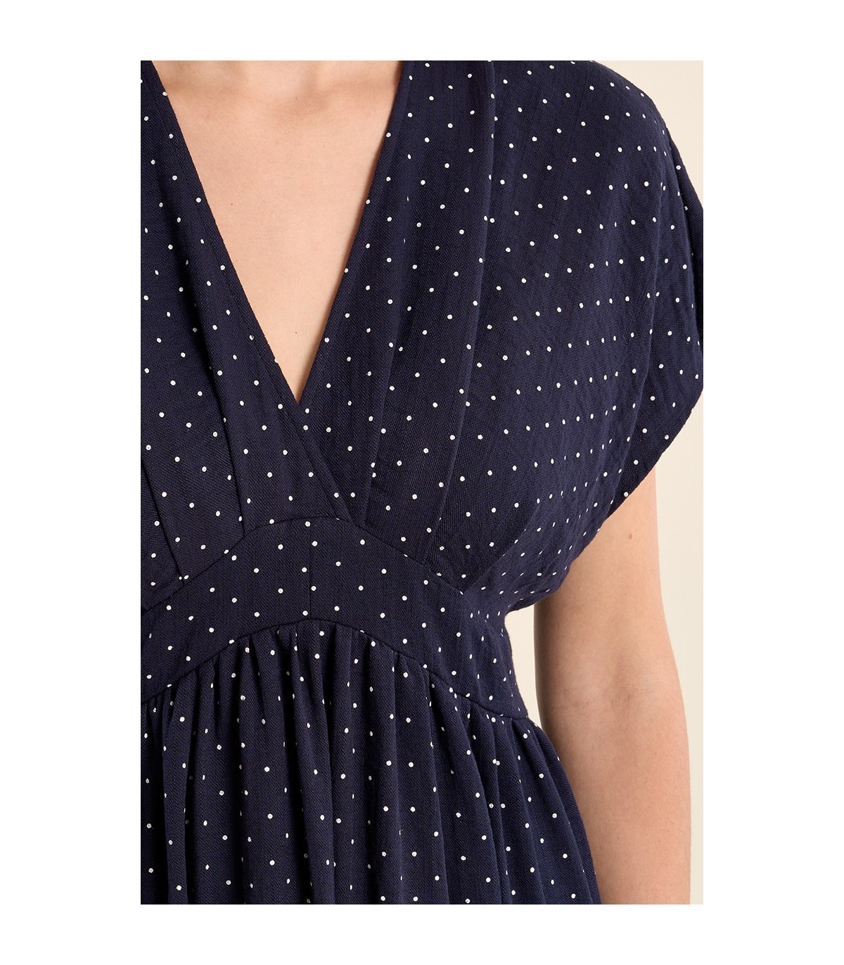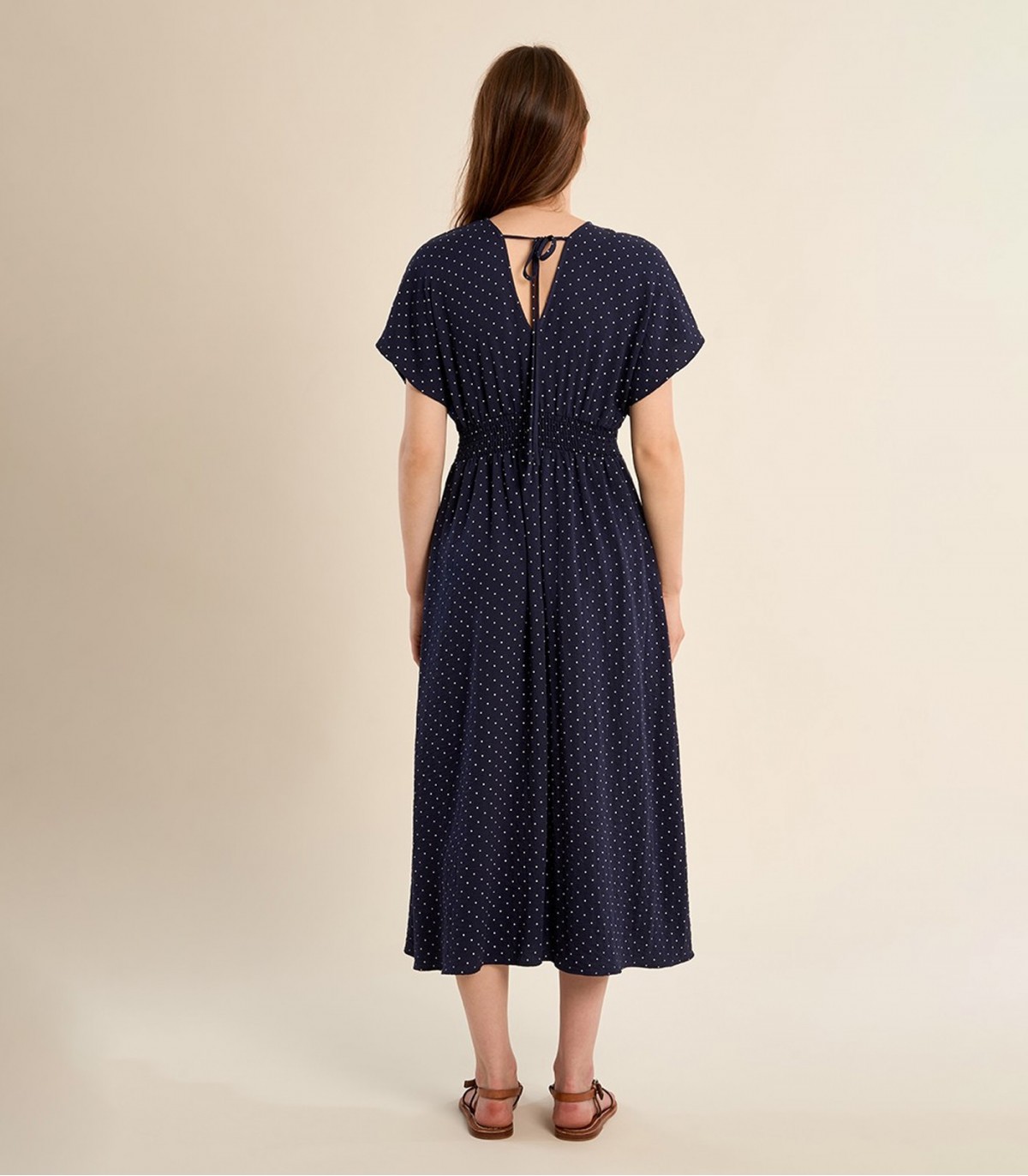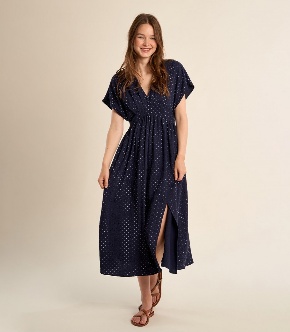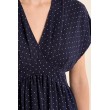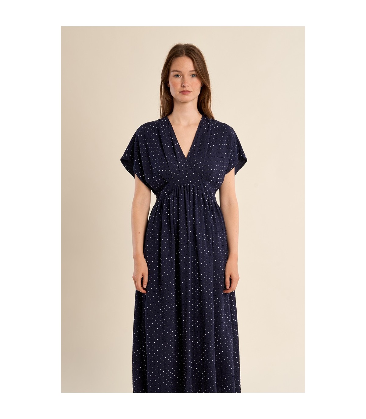 Šī sieviešu garā kleita ar punktiņiem ir viegls un sievišķīgs apģērba gabals, kas lieliski piemērots siltākajai sezonai. Brīvais piegriezums apvienojumā ar elastīgo jostasvietu skaisti izceļ vidukli un rada graciozu izskatu.