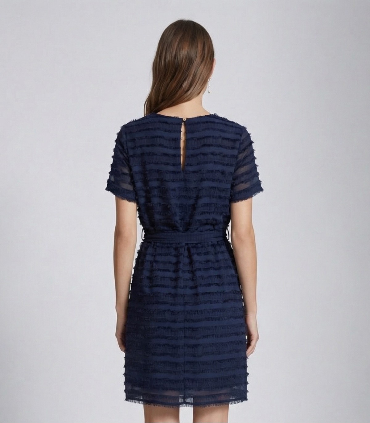 Eleganta un pievilcīga sieviešu Denim Dream kleita ar bārkstīm. Jostaina josta rada sievišķīgu siluetu, un vieglais audums nodrošina ērtu valkāšanu.