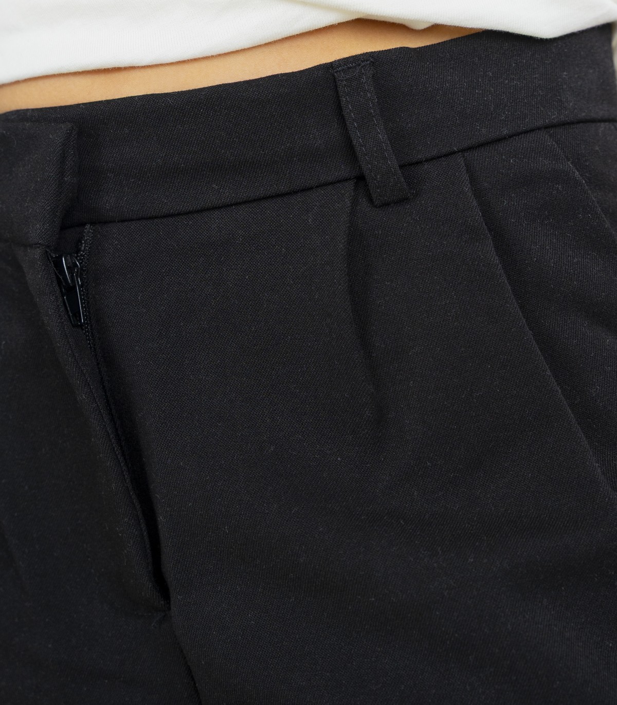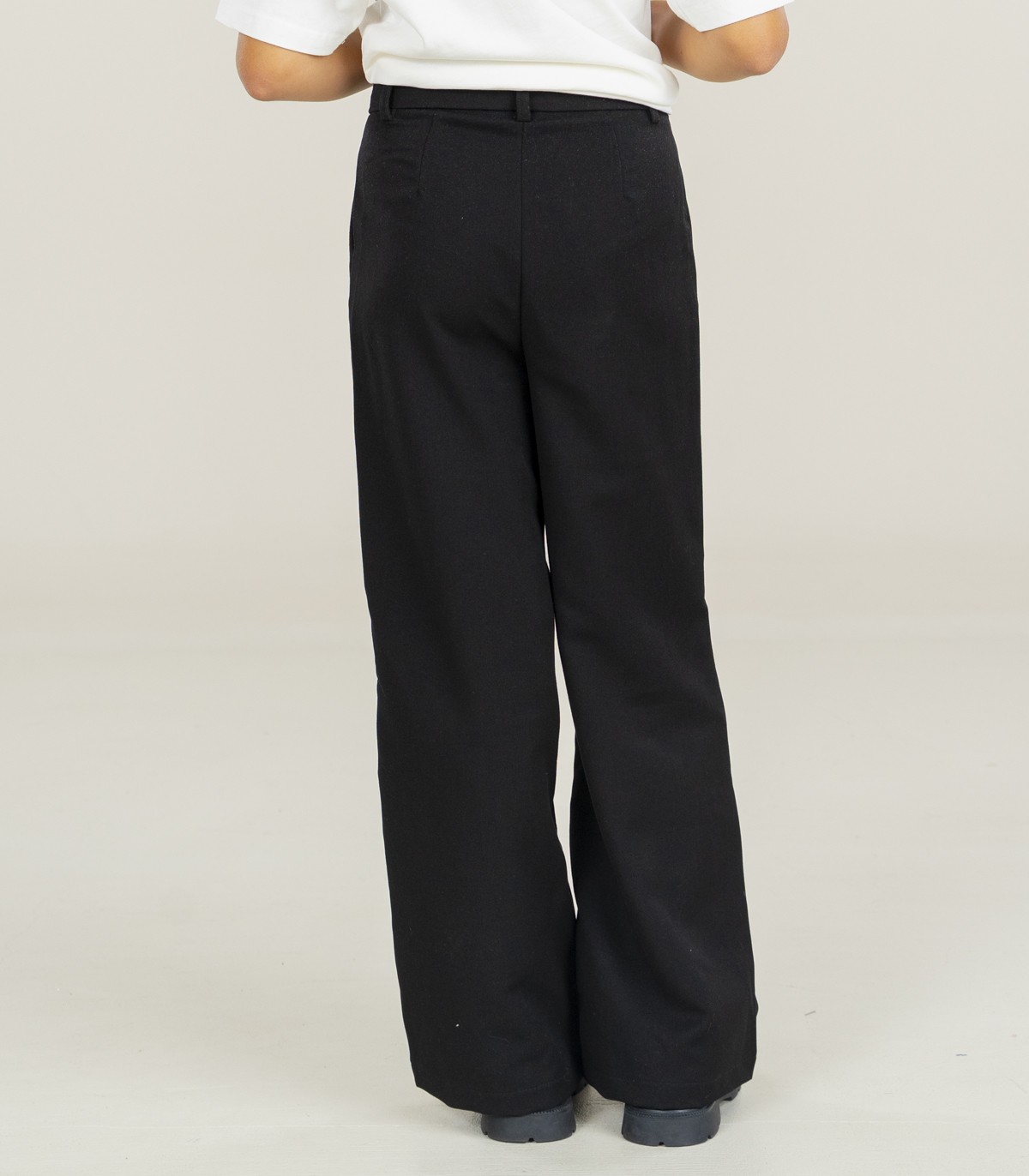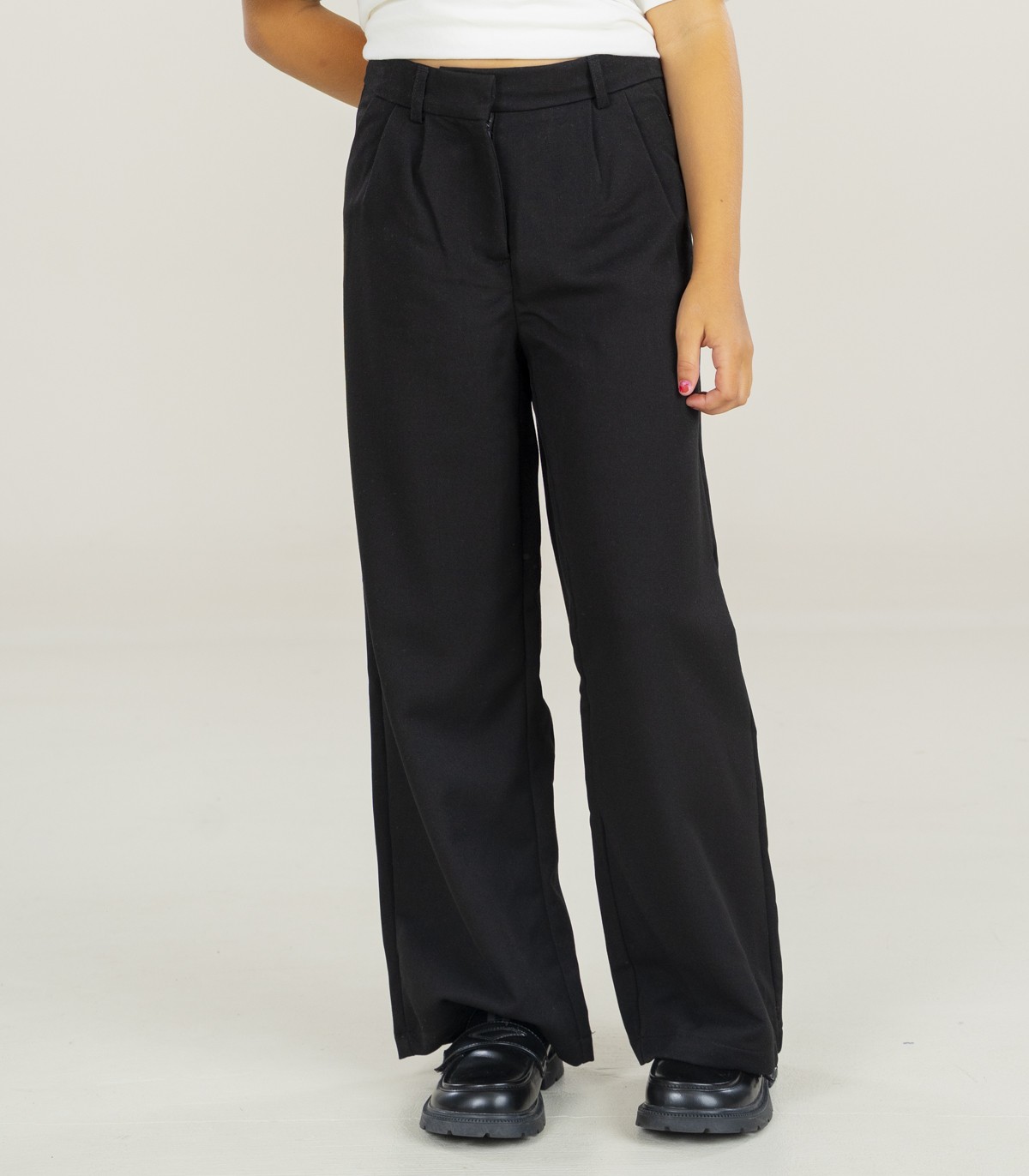 Ērtas un modernas melnas bērnu bikses ar platām starām. Klasisks piegriezums un mīksts audums ir ērti valkājami gan ikdienā, gan svinīgākos gadījumos. Bikses aiztaisāmas ar pogu un rāvējslēdzēju.