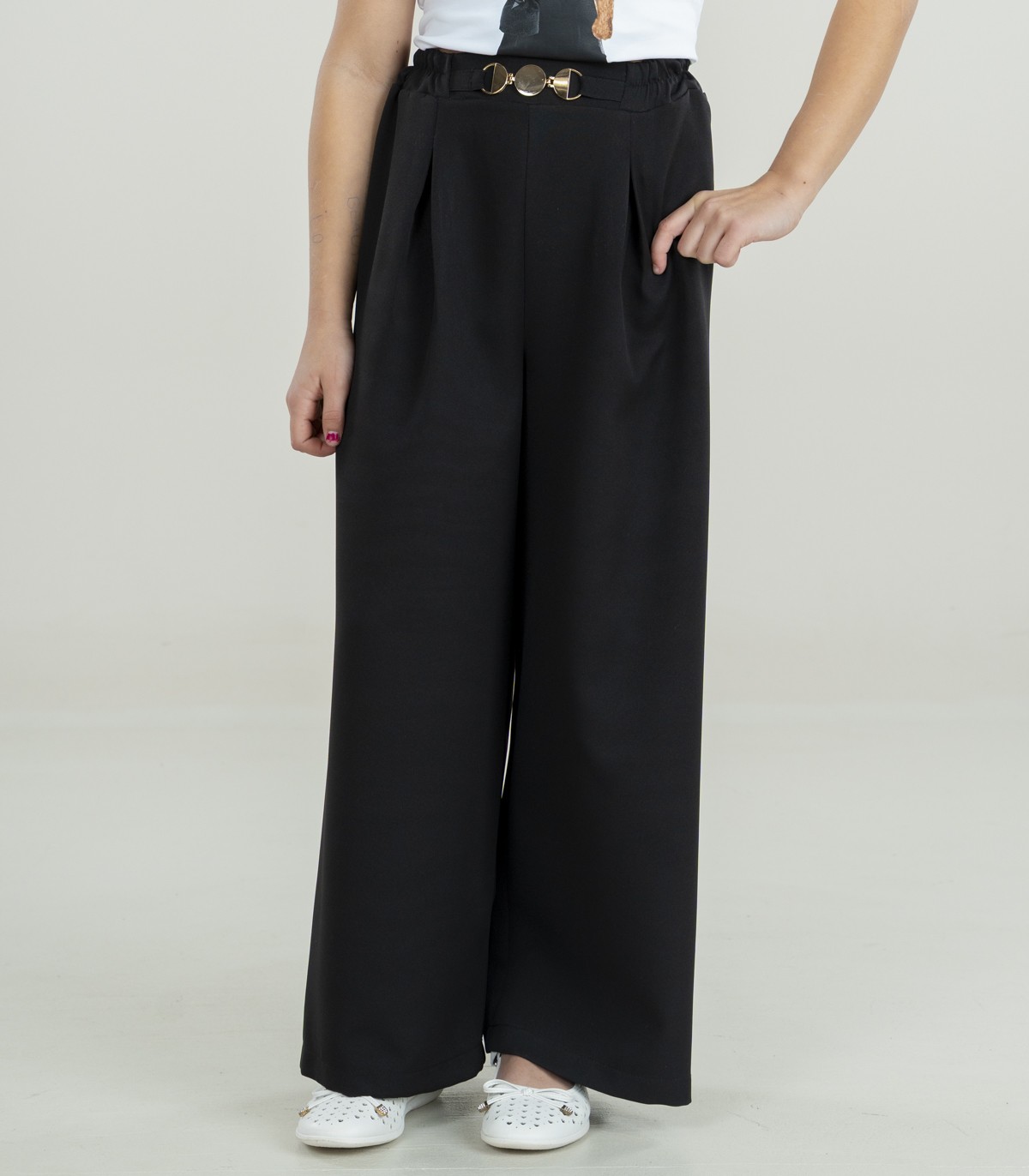 Šīs melnās platās bikses ir lieliski piemērotas gan skolai, gan svinīgiem pasākumiem. Tām ir elastīga jostasvieta ar dekoratīvu zelta sprādzi. Audums ir mīksts un patīkams pieskārienam.