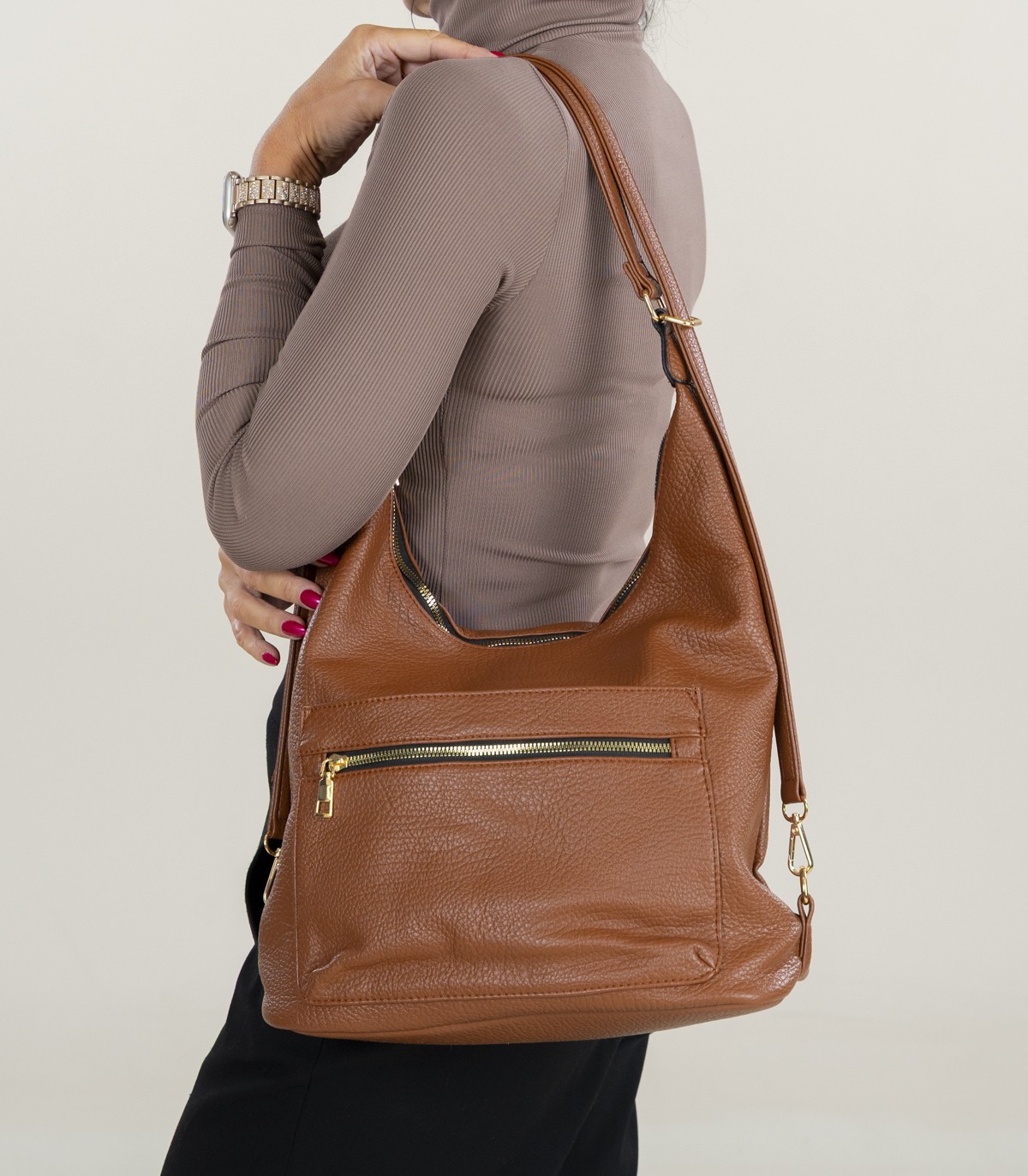 Sieviešu plecu soma, kas izgatavota no izturīgas, teksturētas mākslīgās ādas. Šī ietilpīgā un praktiskā soma ir ideāli piemērota ikdienas lietošanai, ar vairākām kabatām nepieciešamo lietu glabāšanai.