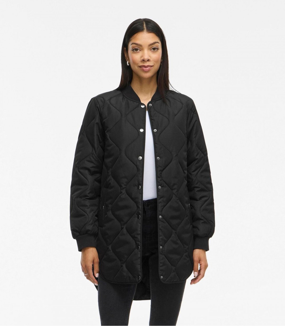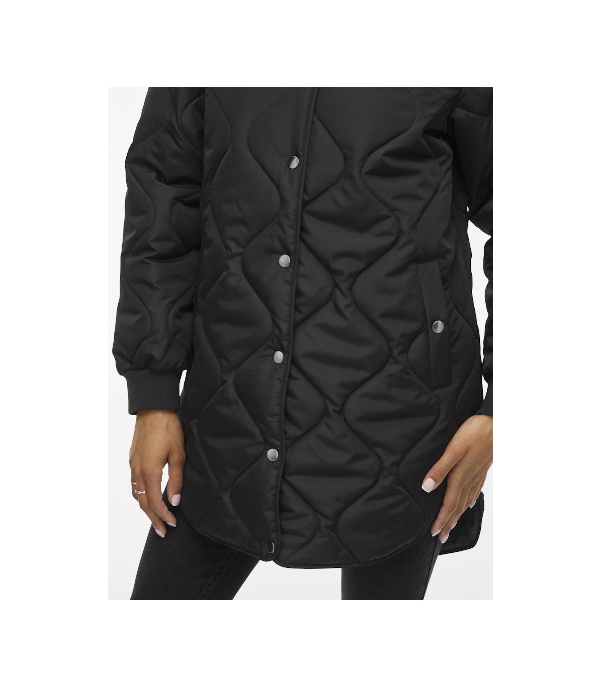 Šī sieviešu stepētā jaka ir moderna un praktiska. Rievotas aproces nodrošina ērtu piegulšanu un aizsardzību pret vēju. Ērta spiedpogas aizdare akcentē minimālistisko dizainu, savukārt pagarinātā muguras daļa nodrošina papildu komfortu.