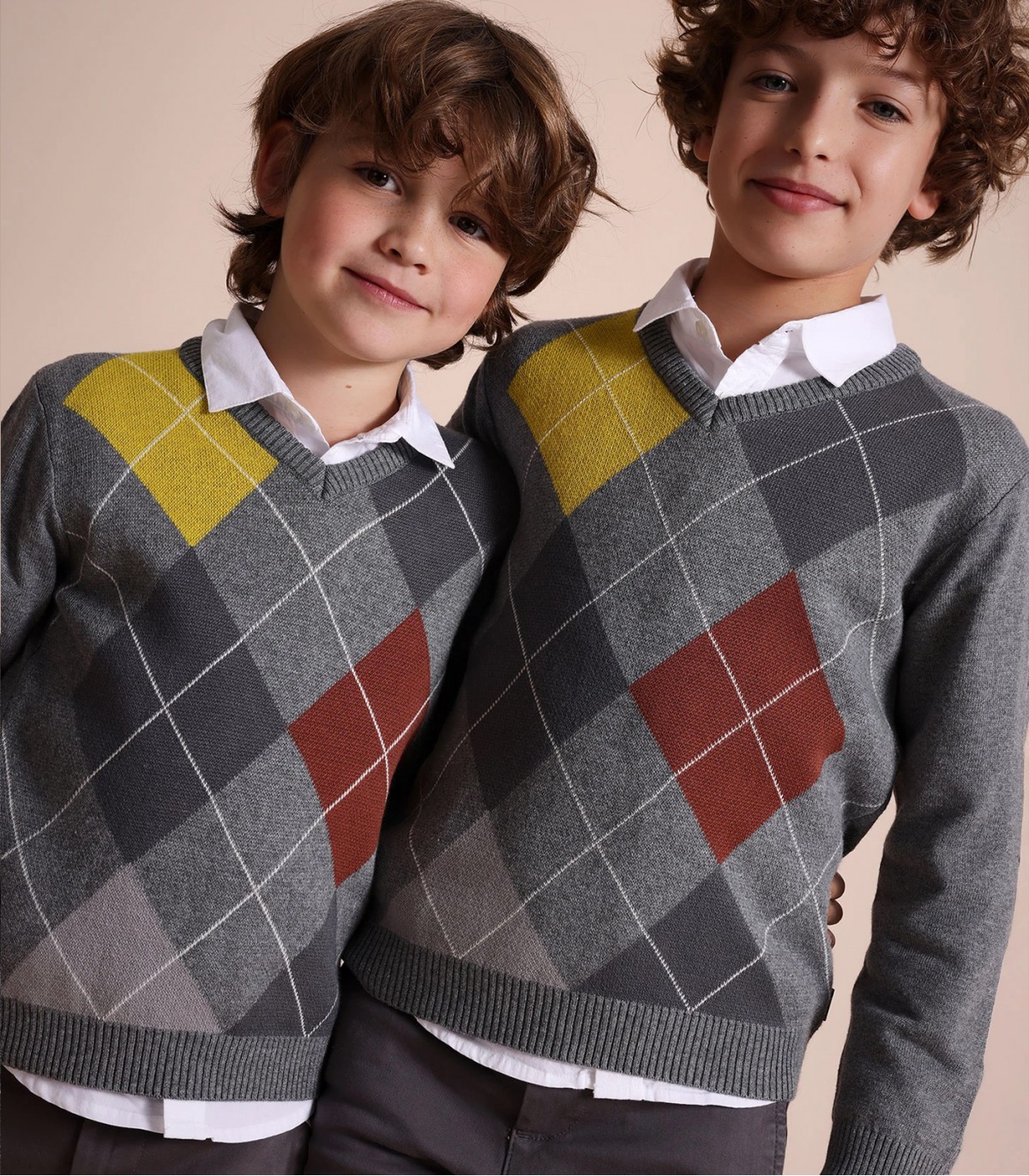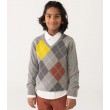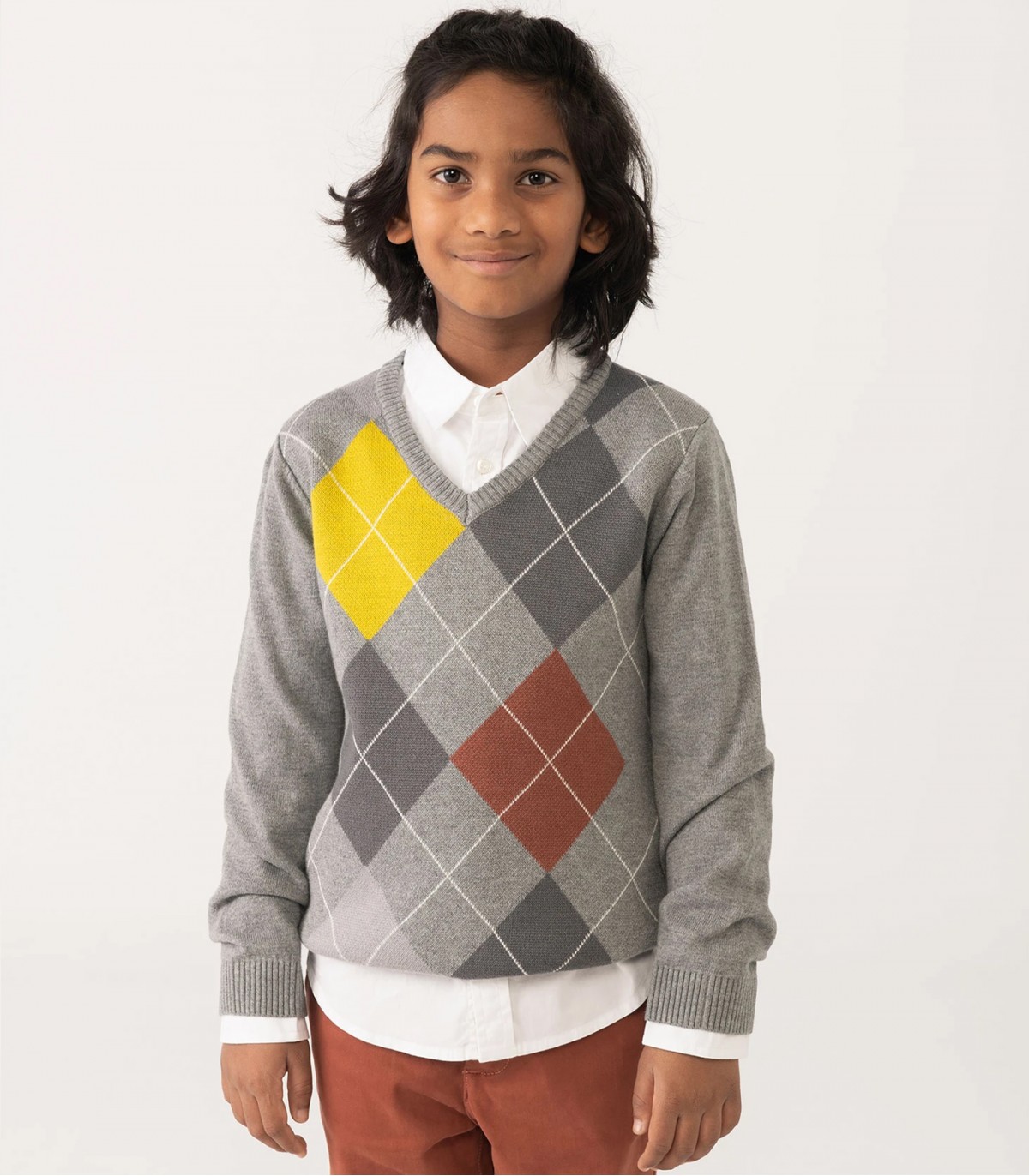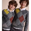 Klasisks un ērts džemperis zēniem. Moderns romba raksts priekšpusē, V veida kakla izgriezums un rievota apdare.