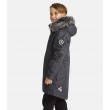 • Augstā apkakle vienmērīgi ieplūst aizsargājošā fiksētā kapucē ar figūrveida flīsu iekšpusē un pūkainu mākslīgās kažokādas oderi.