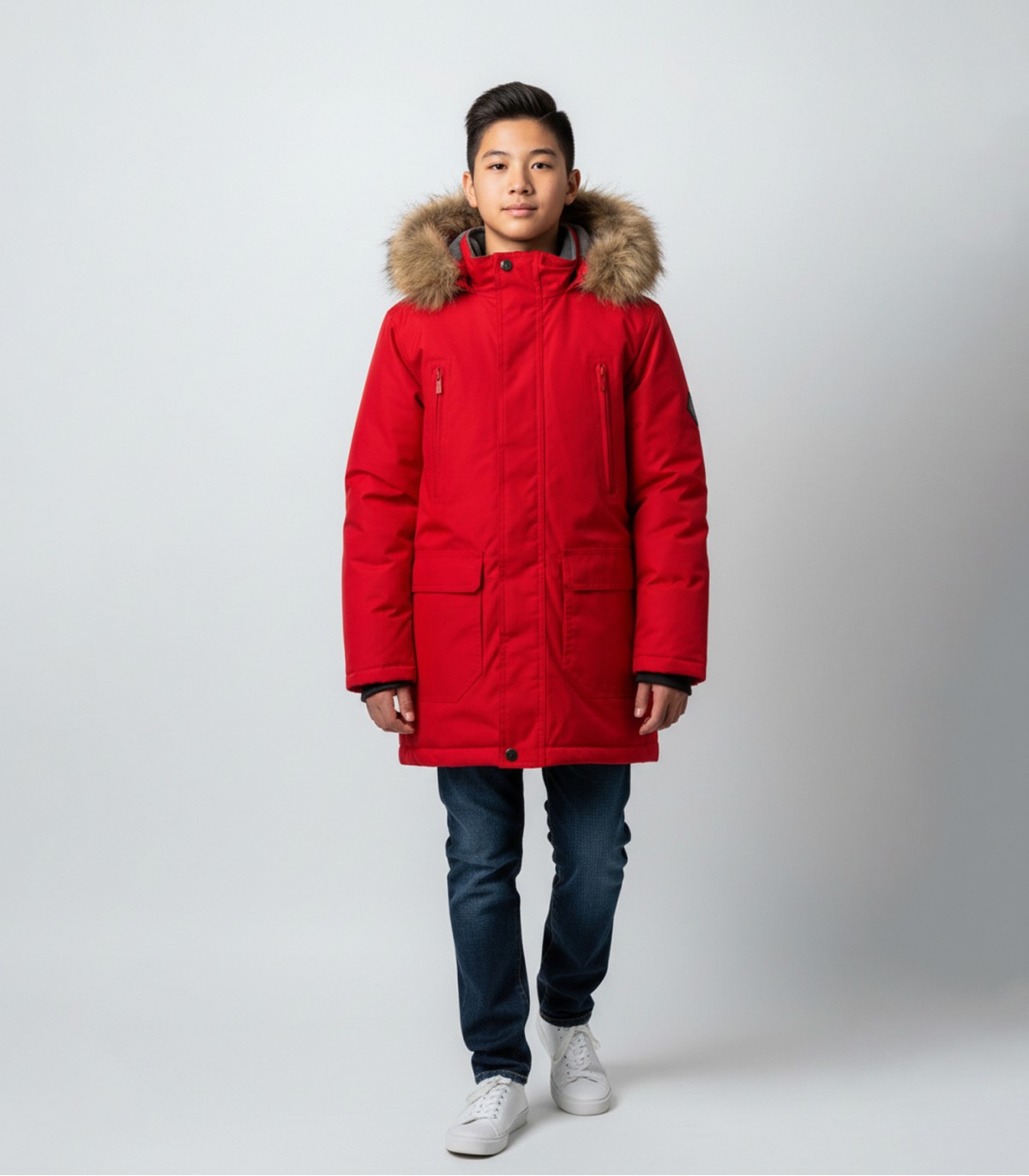 - Mākslīgās kažokādas apdare uz kapuces.