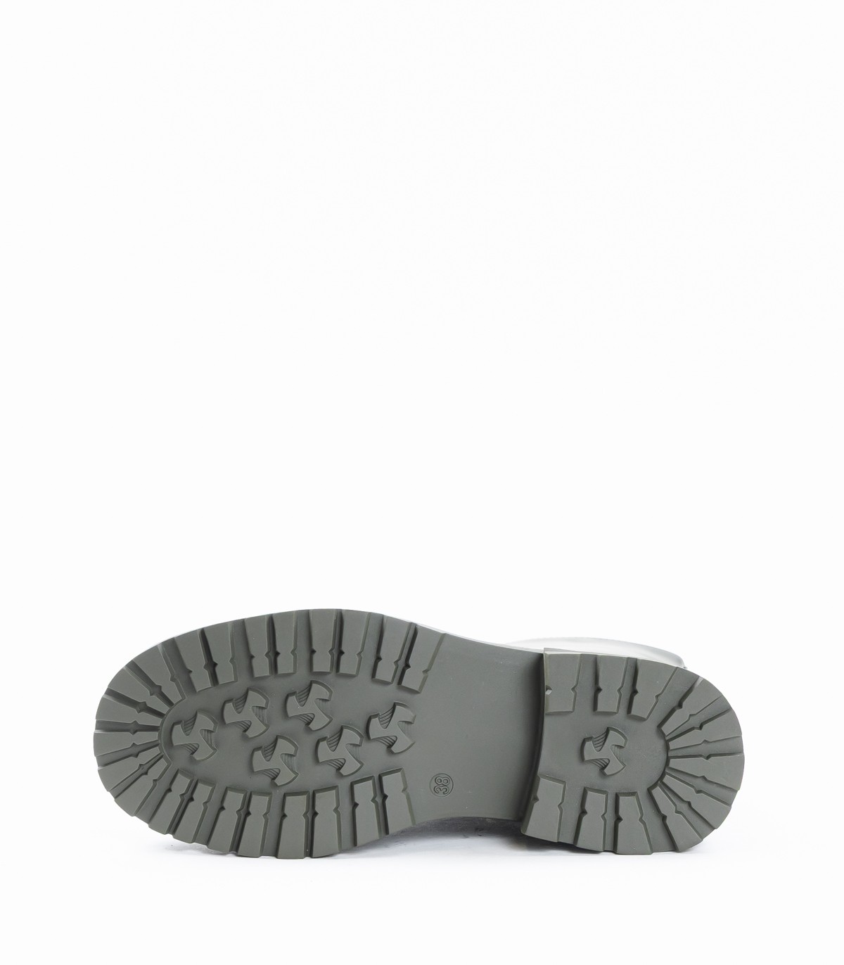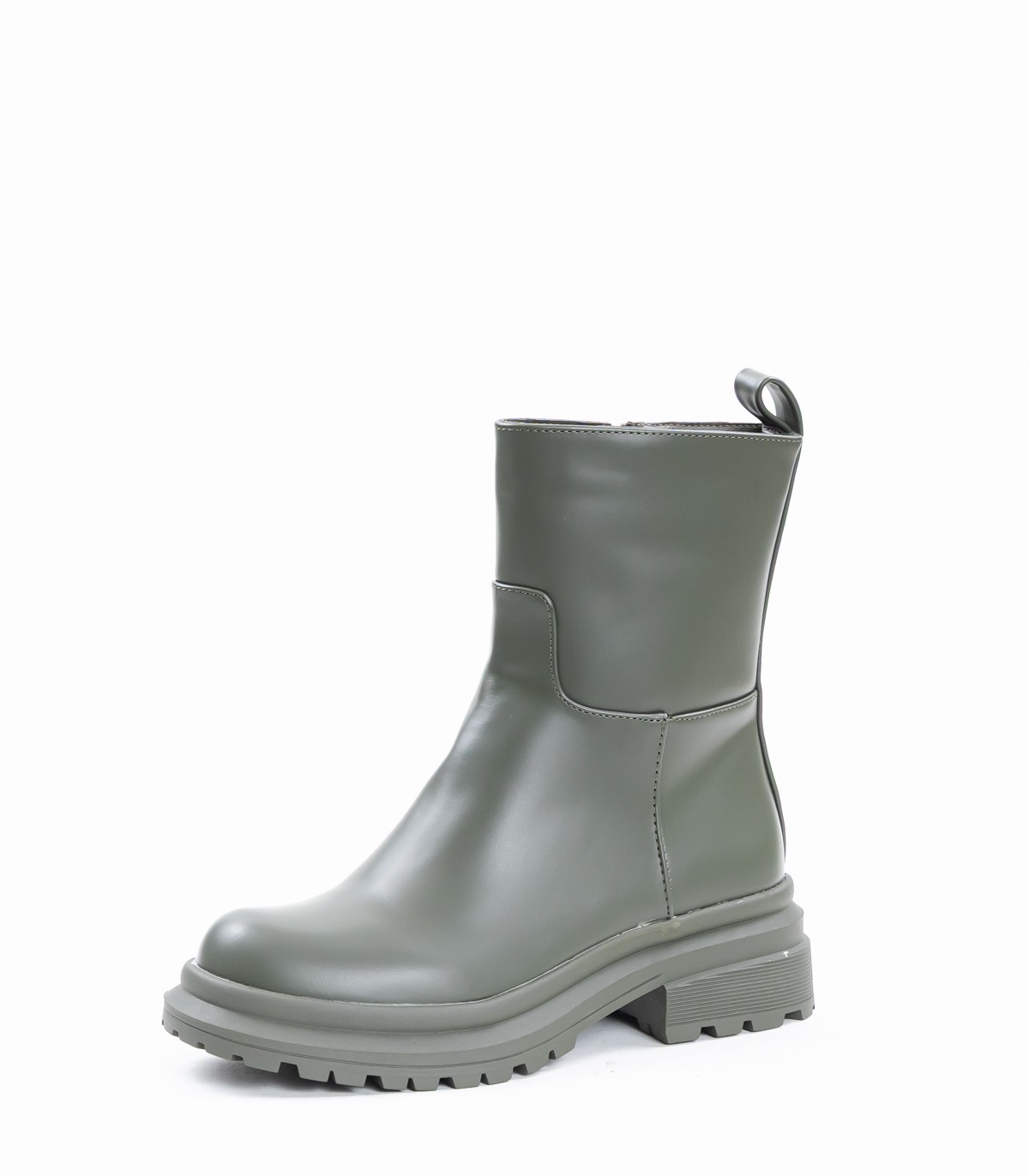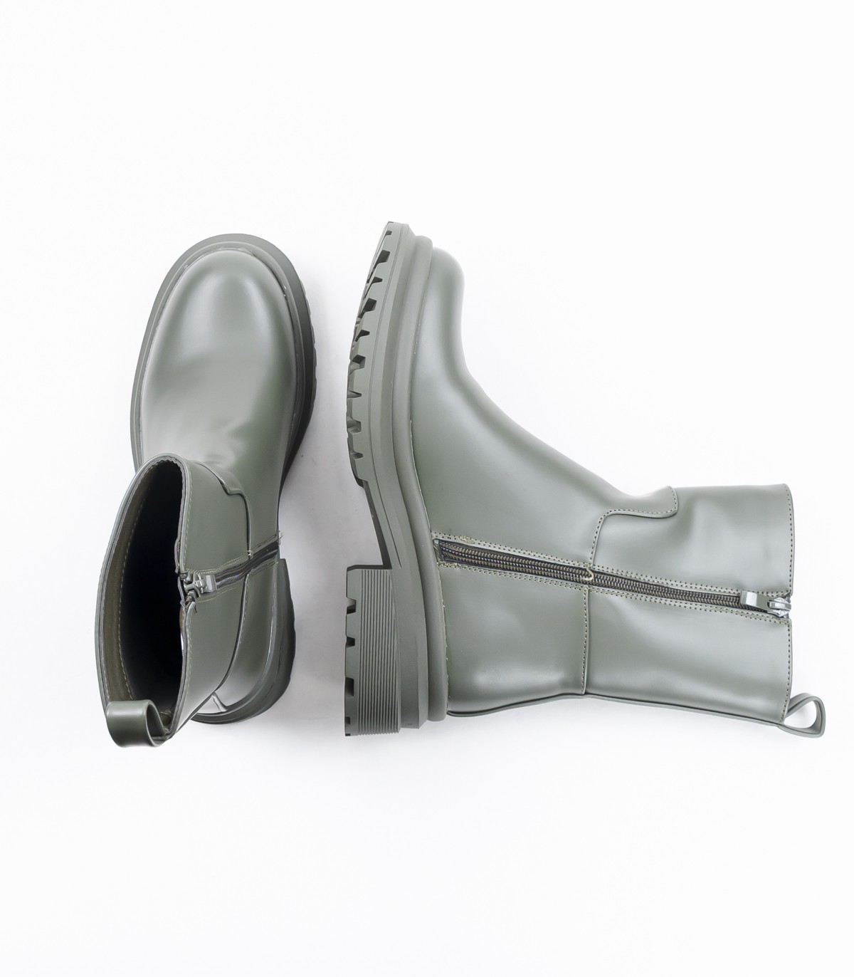Sieviešu puszābaki zaļā krāsā. Modelim līdz ikru vidum ir praktisks sānu rāvējslēdzējs, kas atvieglo uzvilkšanu. Biezā zole ar dziļu rakstu nodrošina labu saķeri un stabilitāti.