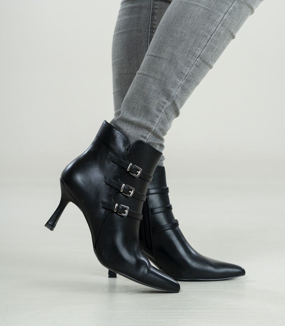 Melni puszābaki ar elegantu dizainu. Tievais papēdis un metāla sprādzes rada stilīgu kombināciju, kas piemērota gan darbam, gan vakara valkāšanai.