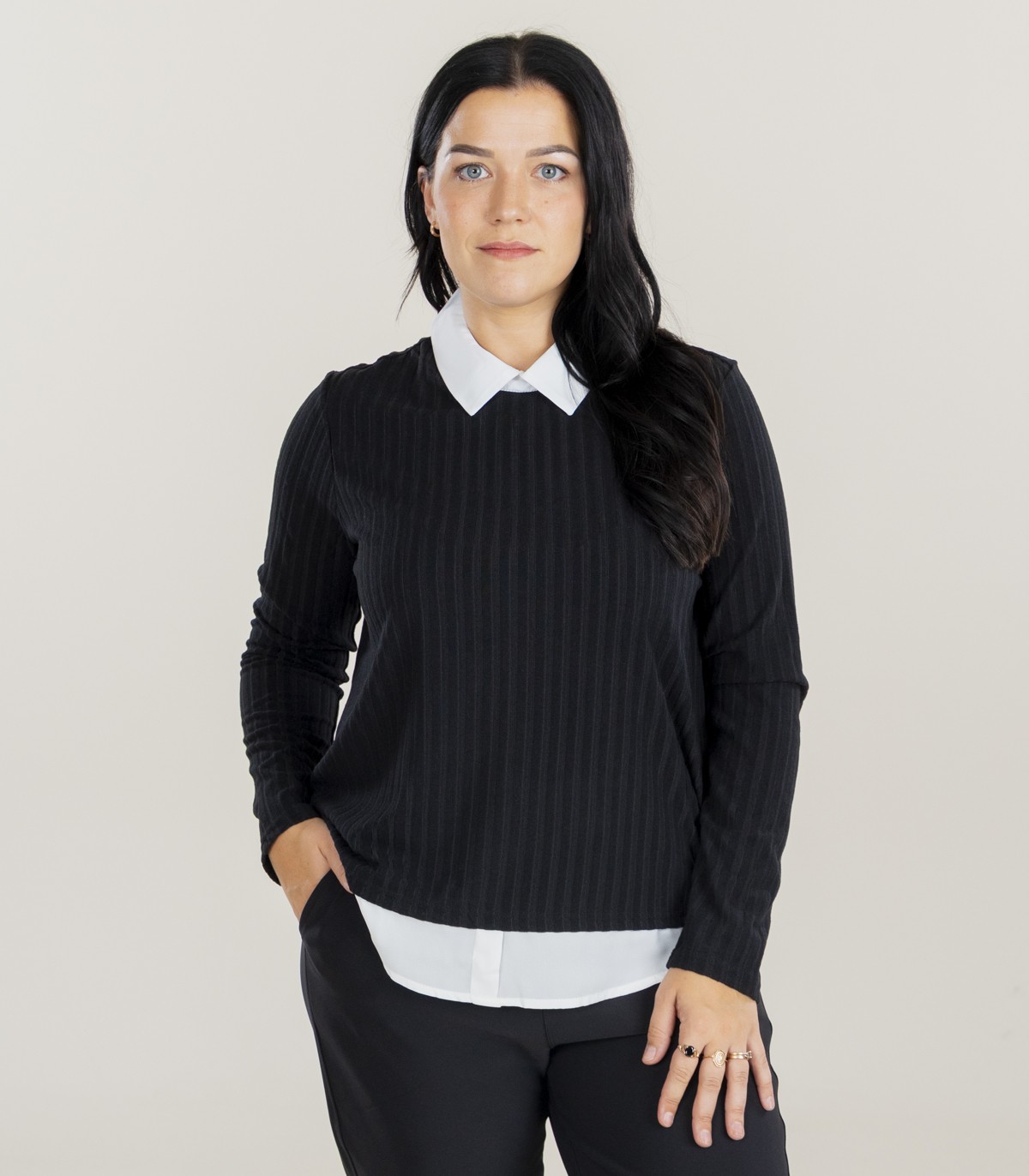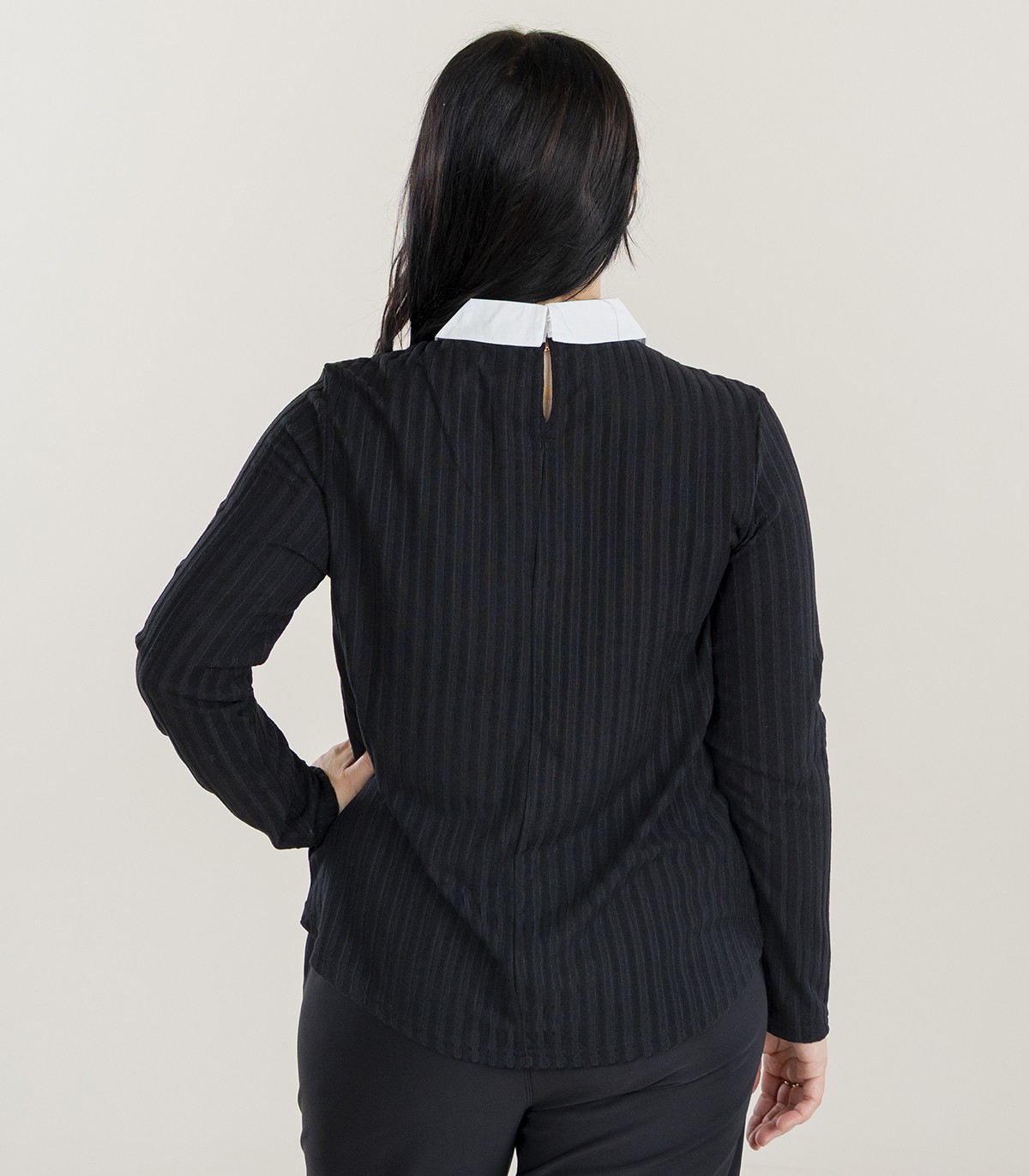 Элегантная чёрная блузка, дополненная контрастным белым воротником и белым слоем ткани по низу, что создаёт эффект многослойности.