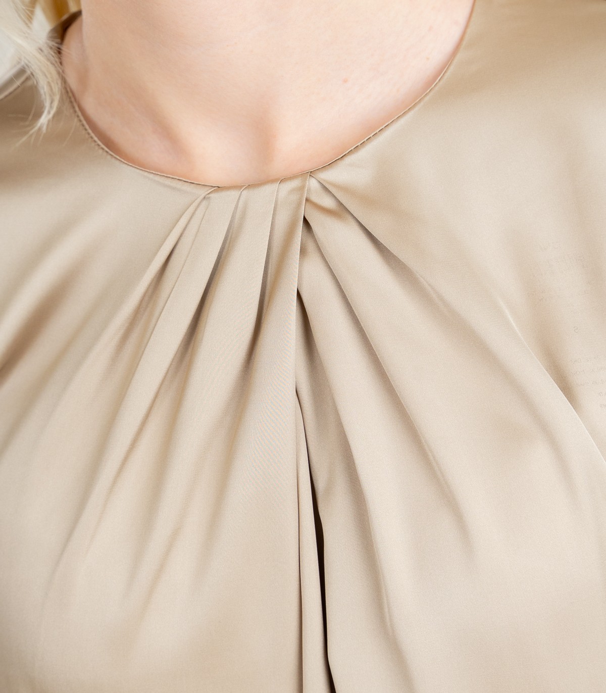 Модель имеет круглый вырез горловины и застёжку на пуговицу сзади, что обеспечивает удобство при надевании и добавляет изящный акцент. Лёгкая и стильная блузка легко сочетается как с классическими брюками и юбками, так и с джинсами, позволяя создавать разные образы — от офисных до вечерних.