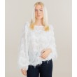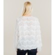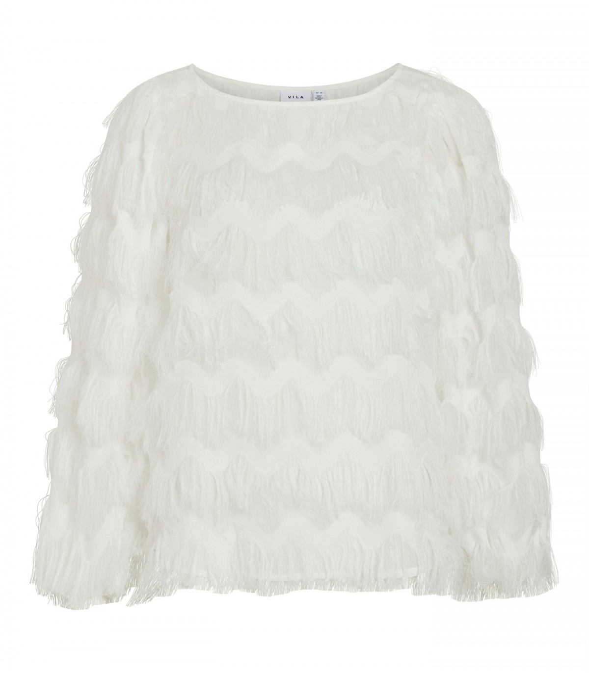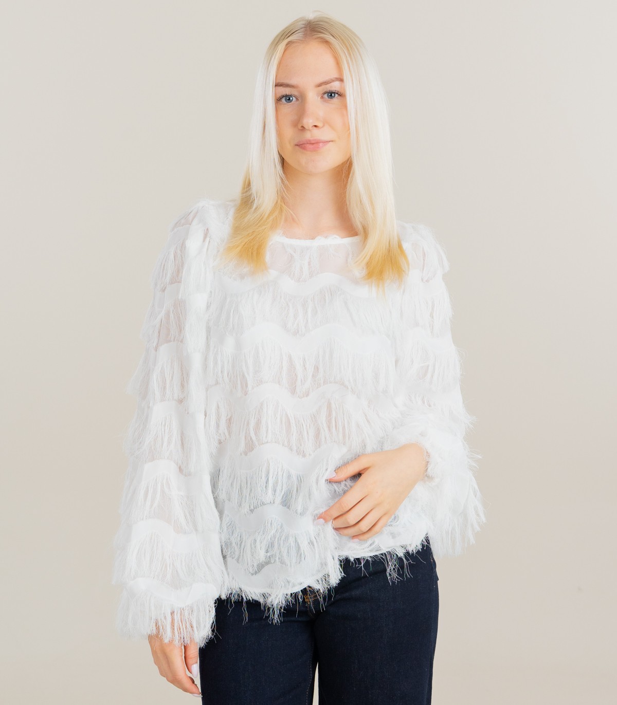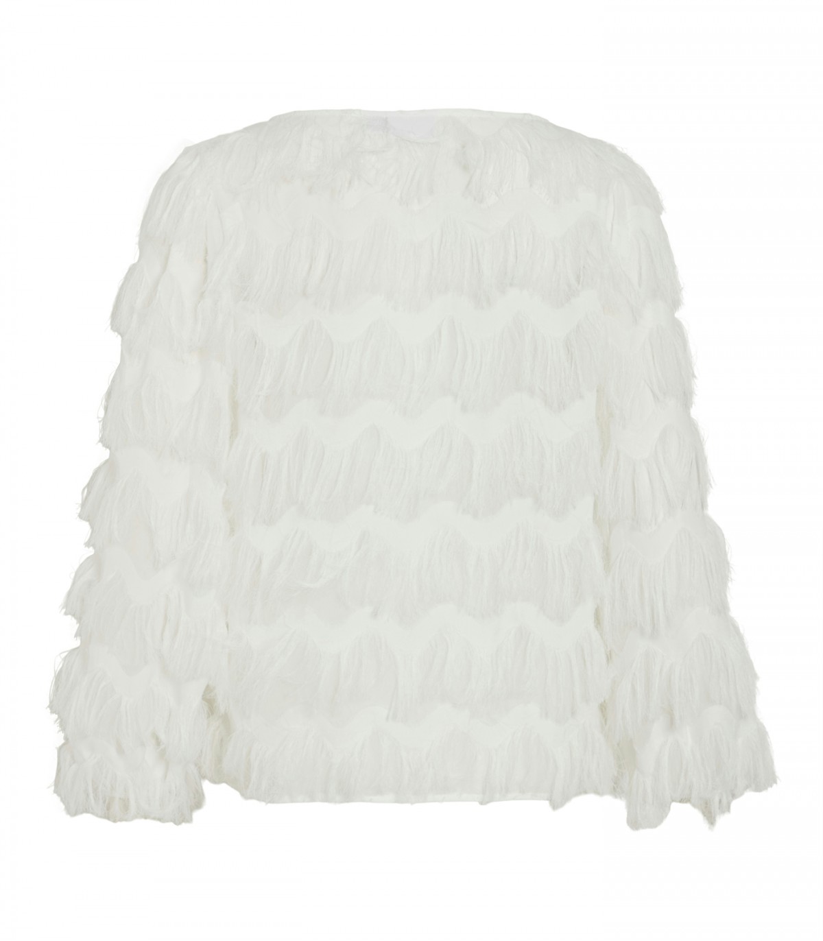 Нарядная и оригинальная блузка добавит эффектности вашему образу. Белая ткань украшена декоративной бахромой, создающей интересную фактуру. Блузка имеет круглый вырез горловины и длинные рукава. Идеально подходит как для торжественных случаев, так и для стильного повседневного образа.