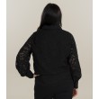 Полупрозрачная блузка черного цвета из бархатистой тисненой ткани. Модель женственного кроя с классическим воротником подойдет как для повседневной носки, так и для более торжественных случаев.
