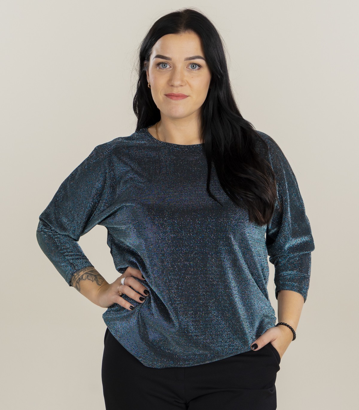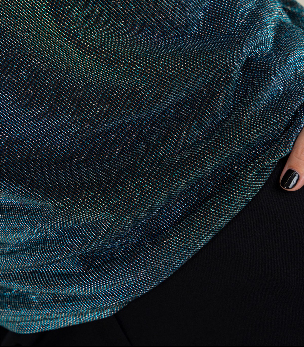 Женская блузка из металлизированной блестящей ткани свободного кроя с рукавами 3/4. Ткань красиво драпируется и идеально сочетается как с брюками, так и с юбками.
