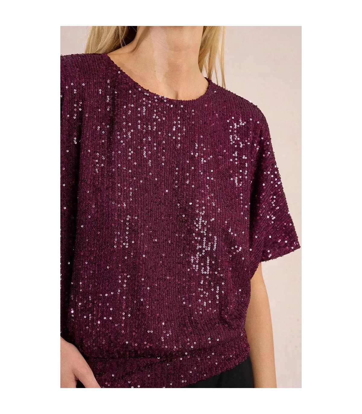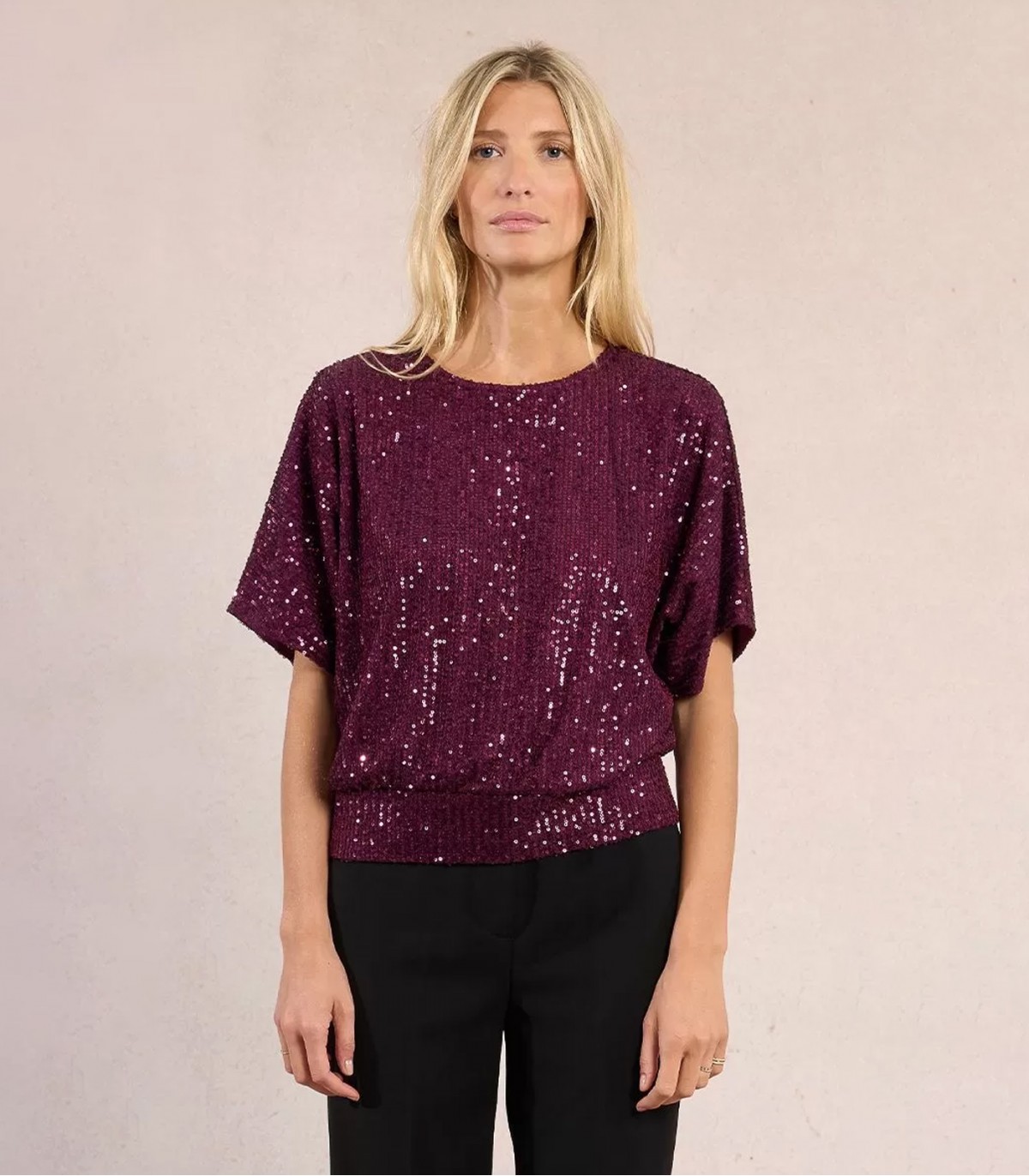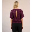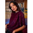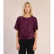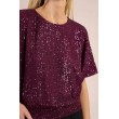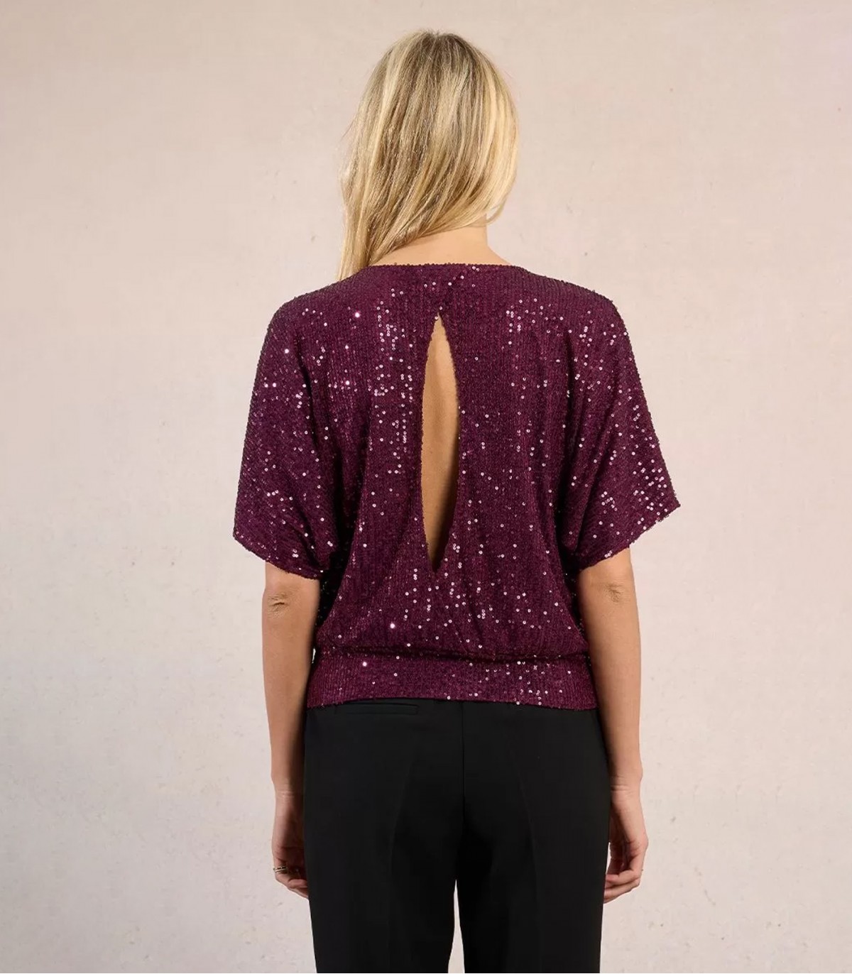 Блузка с короткими рукавами, украшенная пайетками, и открытым вырезом на спине.
