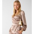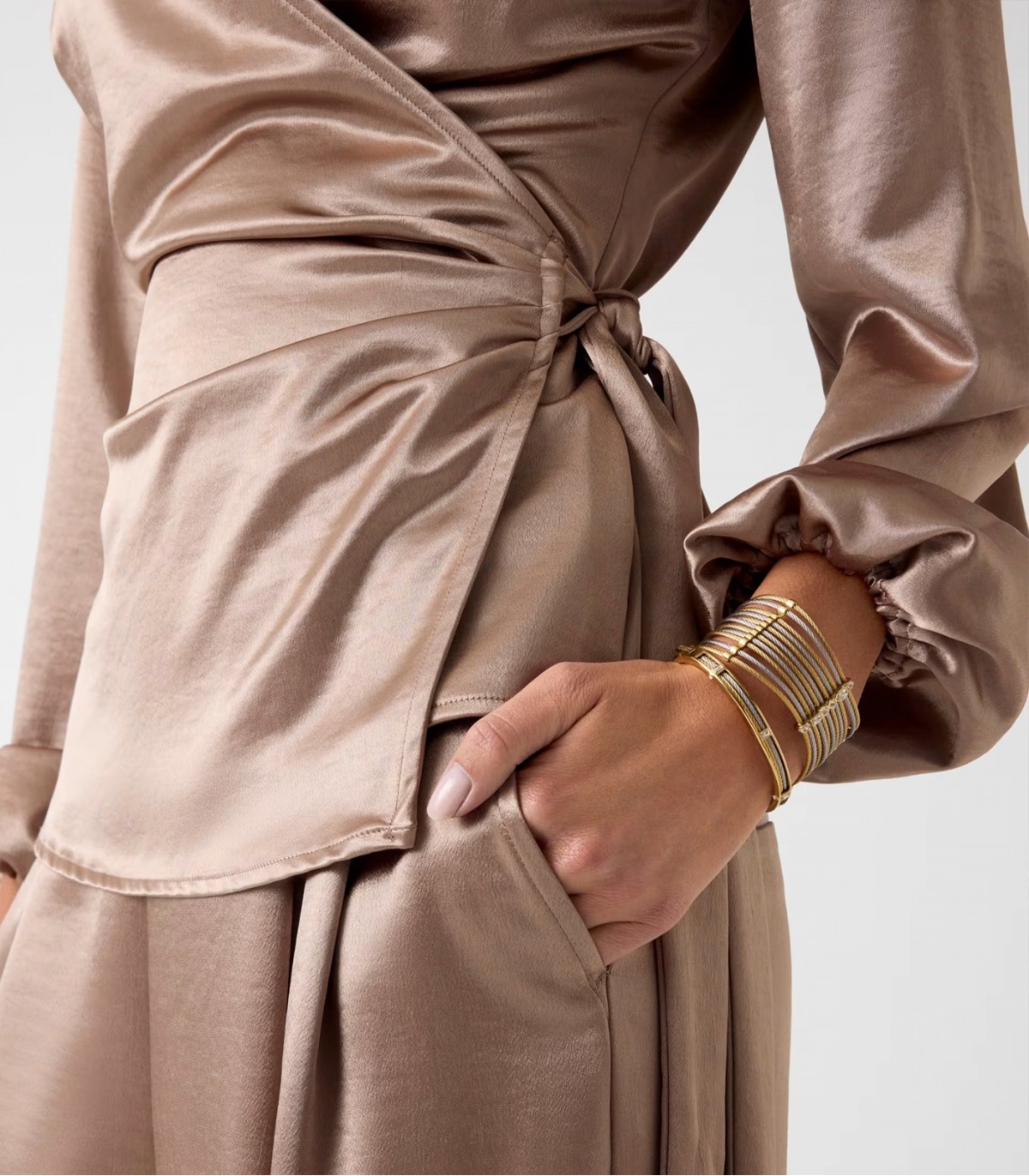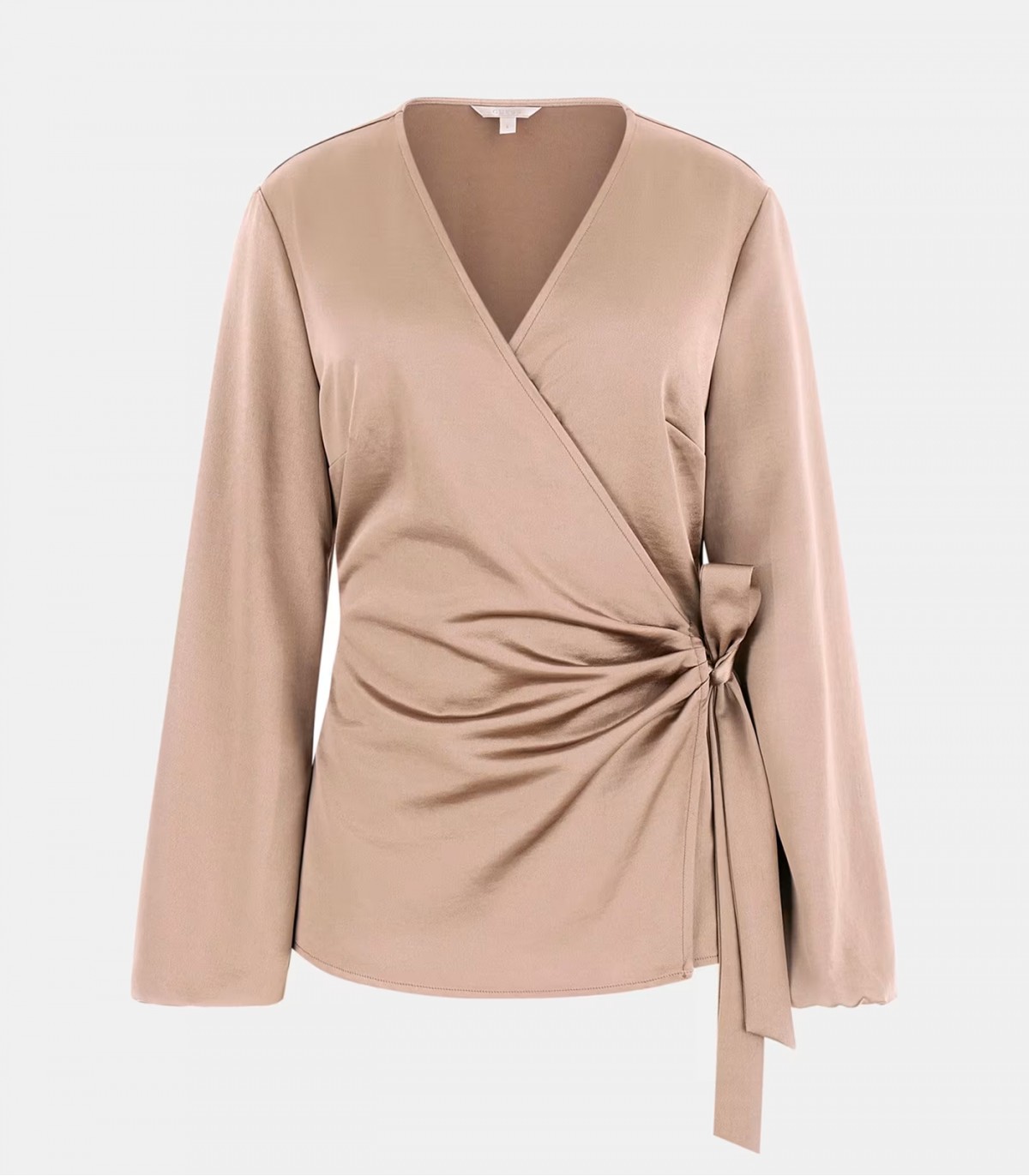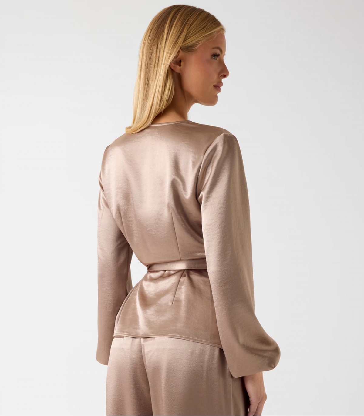 Элегантная женская блузка из блестящего сатинового материала с облегающим кроем создаёт женственный и праздничный образ.