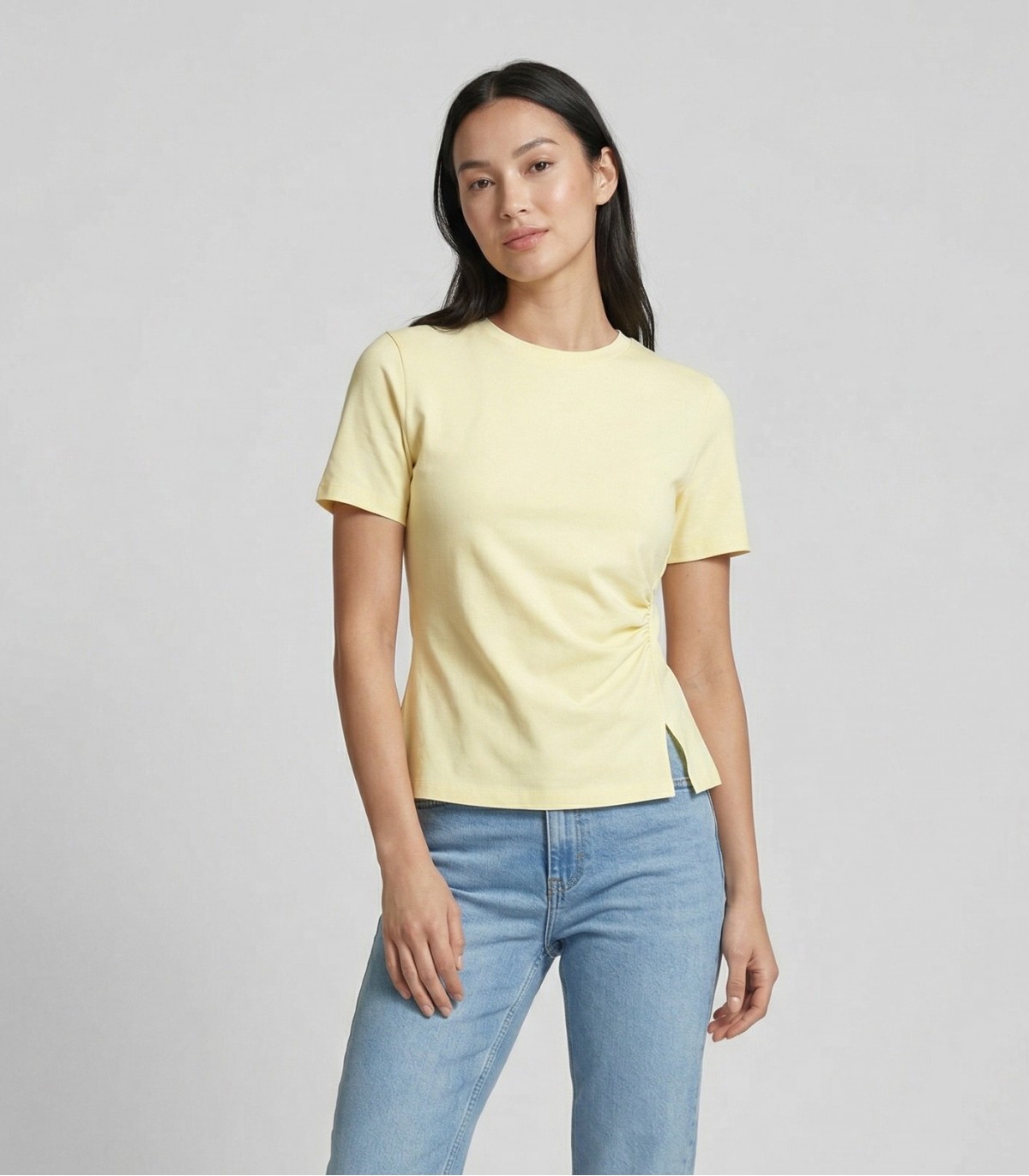 Мягкая и слегка приталенная женская футболка JDY подходит для повседневной носки и легко сочетается с различными брюками и юбками. Дышащая хлопковая ткань приятна на ощупь, а деталь в области промежности сбоку добавляет женственности простому крою.