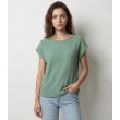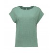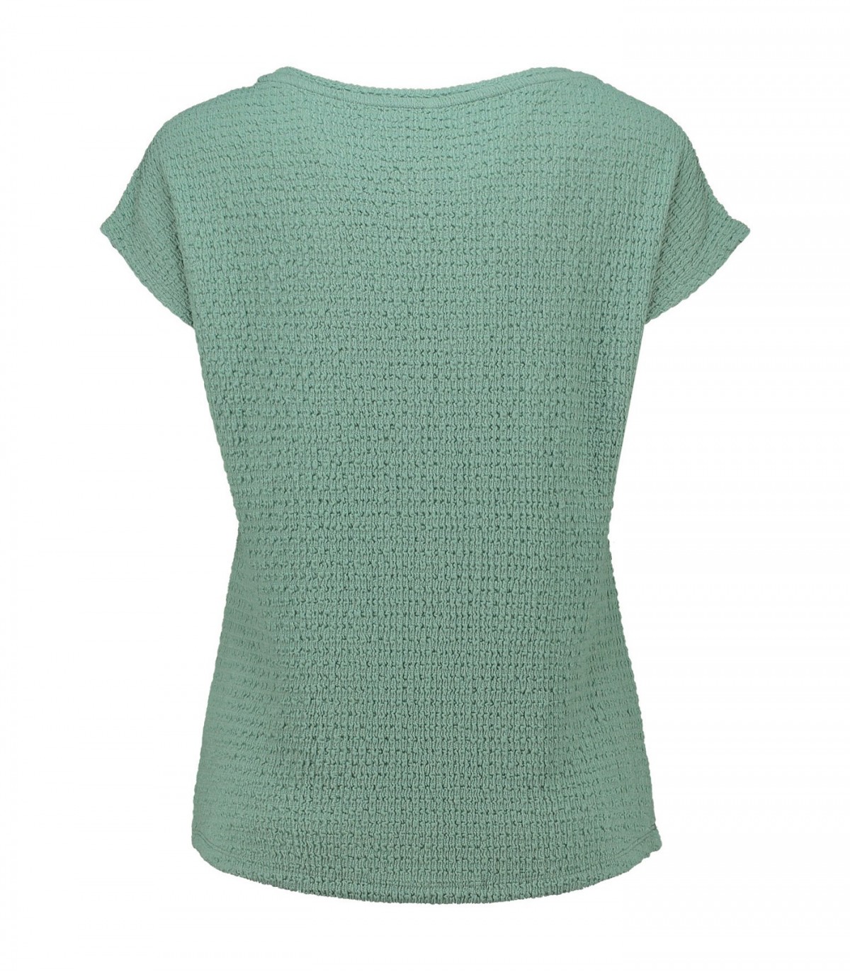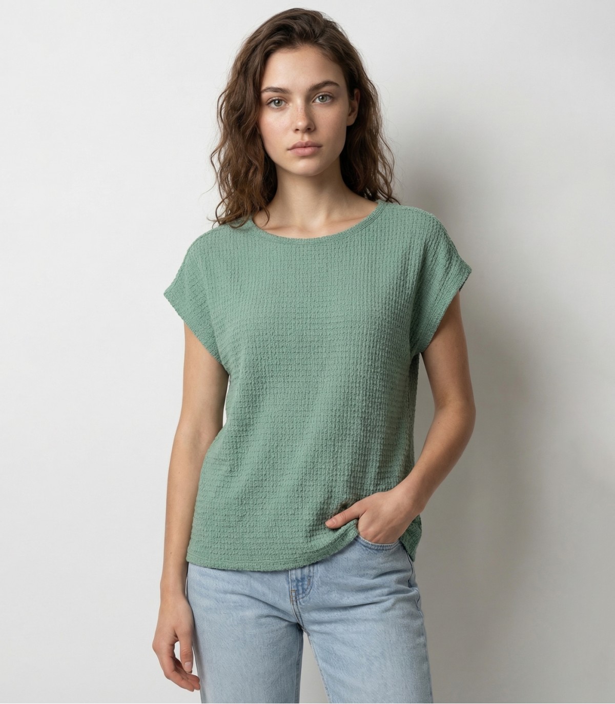 Женская блузка выполнена из материала с текстурированной поверхностью и имеет современный свободный силуэт. Модель с короткими рукавами, приспущенными плечами и круглым вырезом горловины обеспечивает комфорт и лёгкость в повседневной носке. Отлично подходит для летних и повседневных образов.
