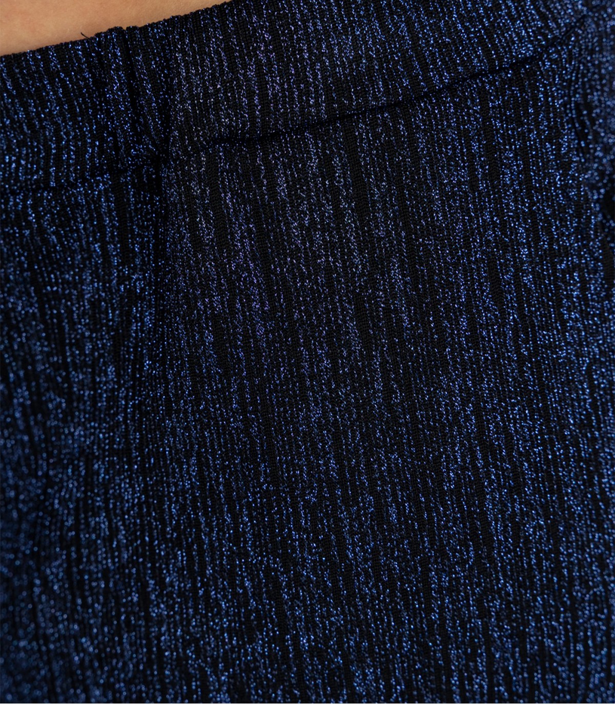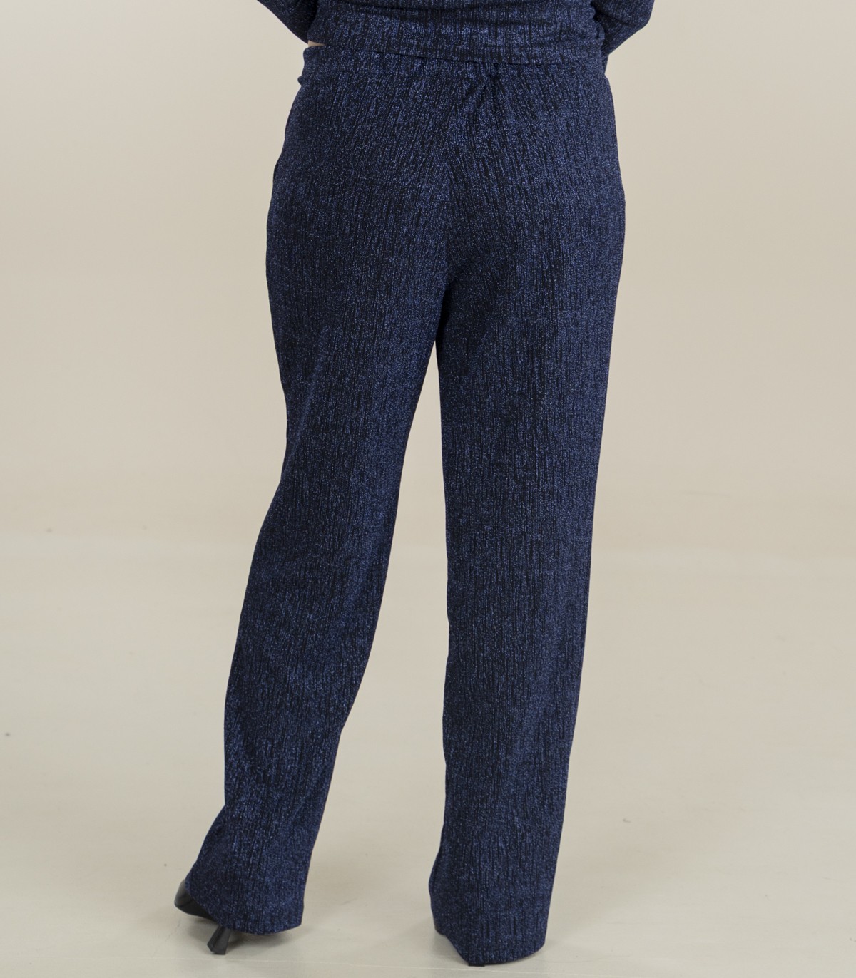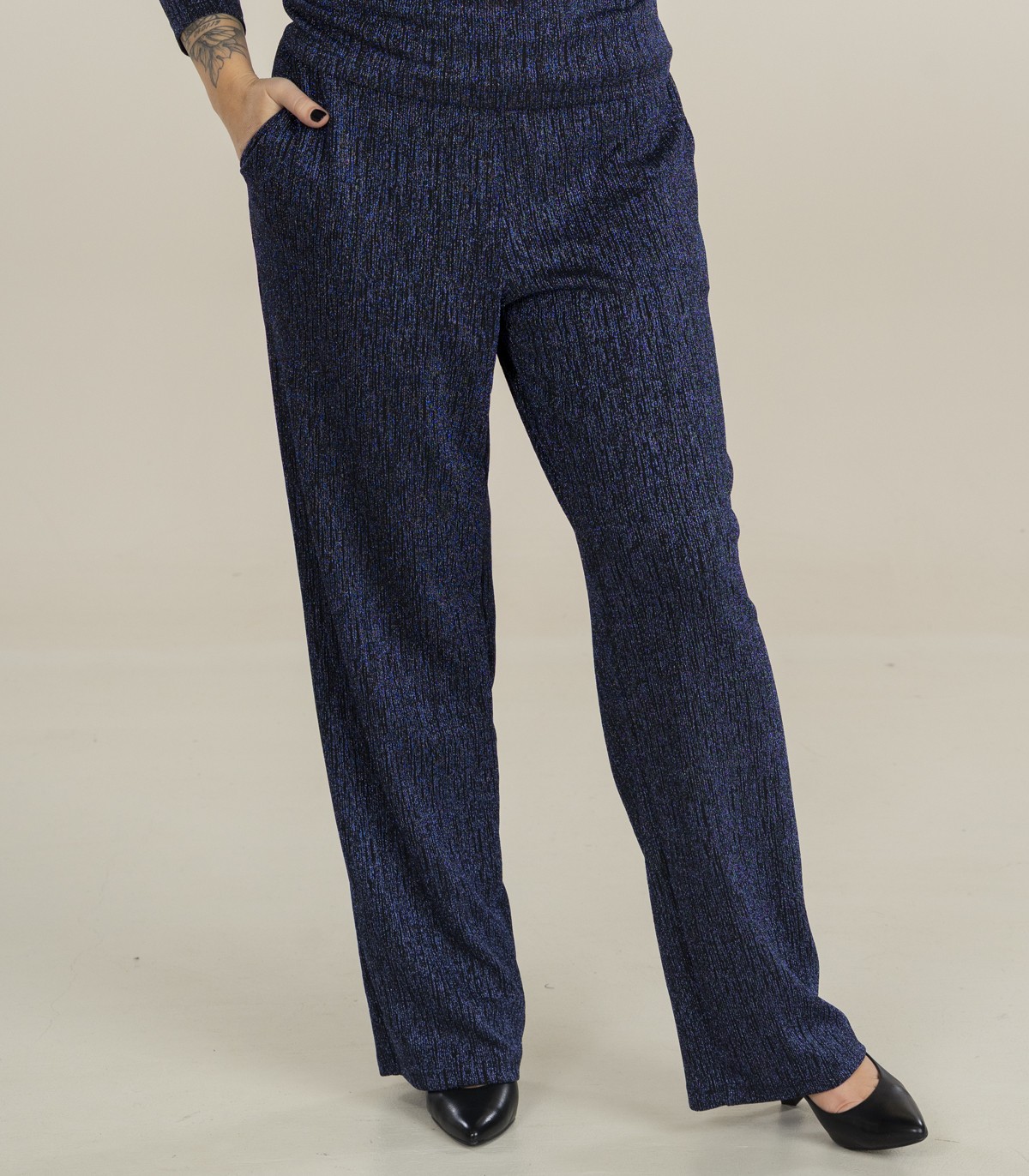 Женские брюки прямого кроя темно-синего цвета из блестящей эластичной ткани. Удобный эластичный пояс хорошо облегает фигуру, а простой крой подходит как для повседневной носки, так и для более официальных образов.