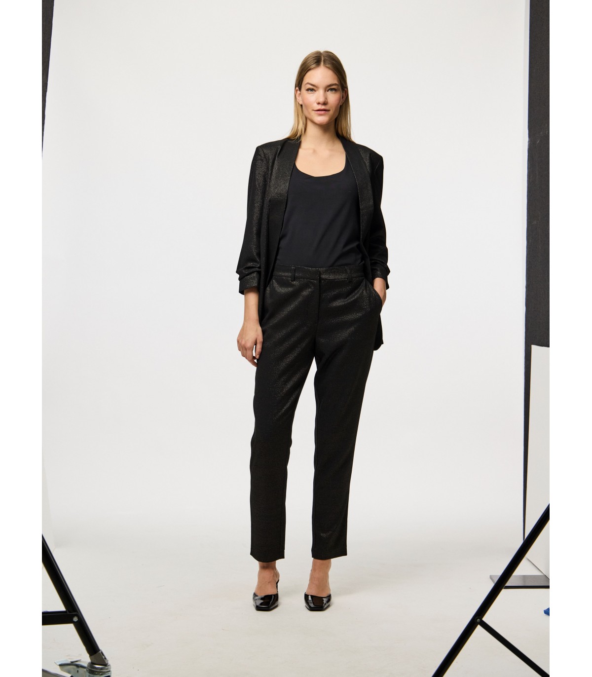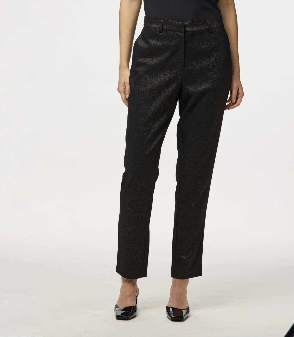 Эффектные женские брюки станут стильным акцентом праздничного гардероба. Модель выполнена с длиной 7/8 и украшена блёстками по всей поверхности, что придаёт образу яркость и динамику.