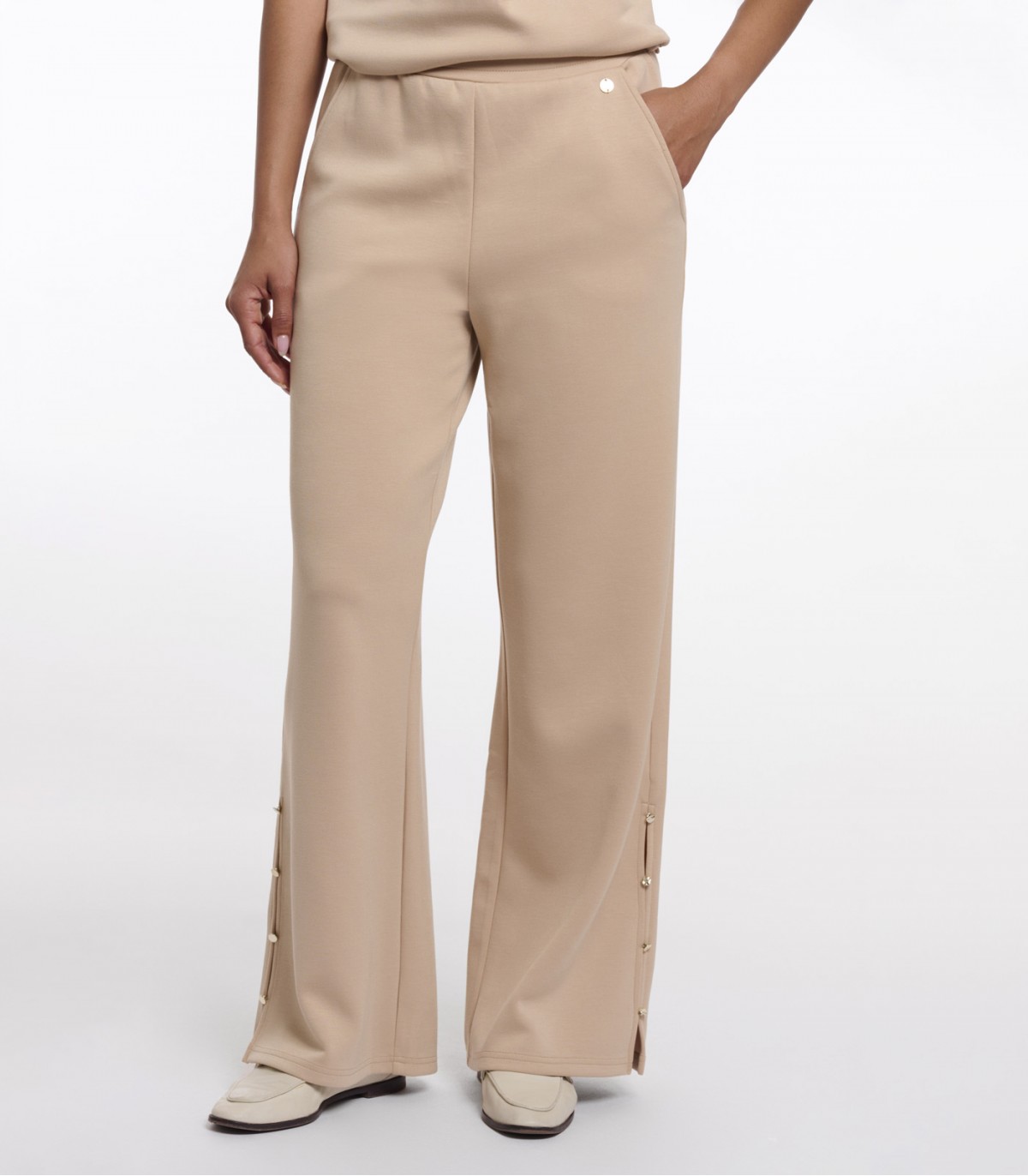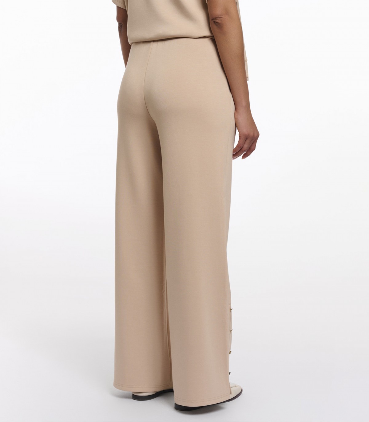 Женский широкие брюки, сшитым из ультрамягкой, слегка эластичной ткани. Изящные боковые разрезы по низу, украшенные элегантными серебристыми заклепками, добавляют образу утонченный современный штрих. Незаметные прорезные карманы завершают образ, делая их одновременно стильными и удобными.