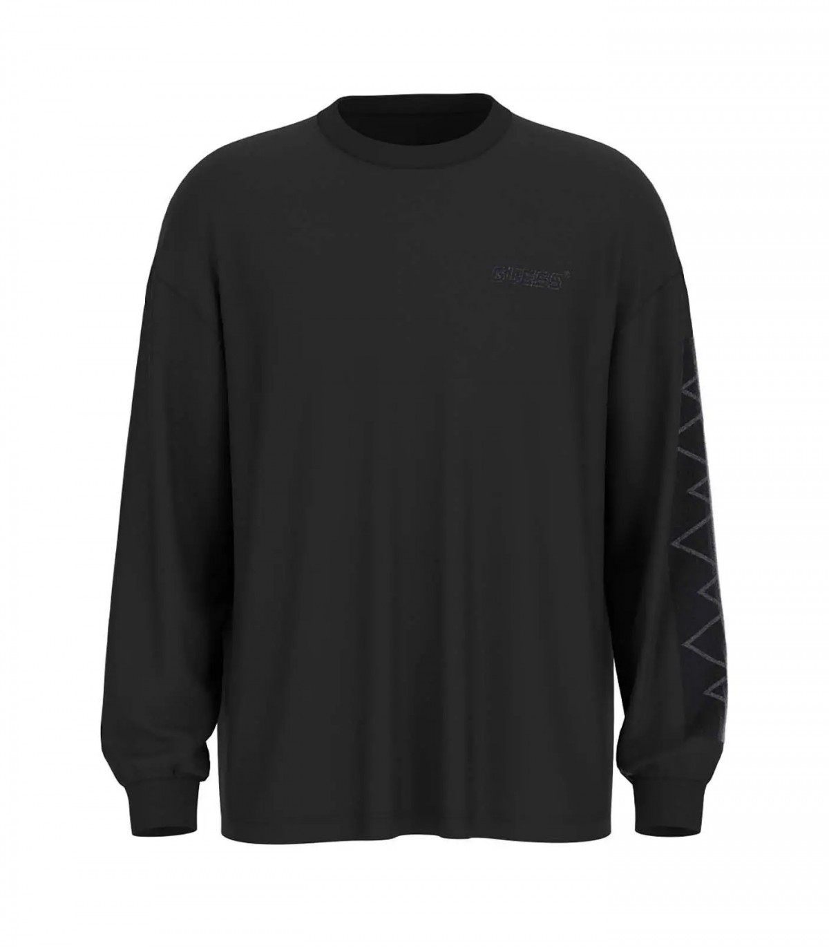 Простая и удобная черная рубашка с длинными рукавами. Украшена едва заметным логотипом Guess на груди и тональным принтом на рукавах.