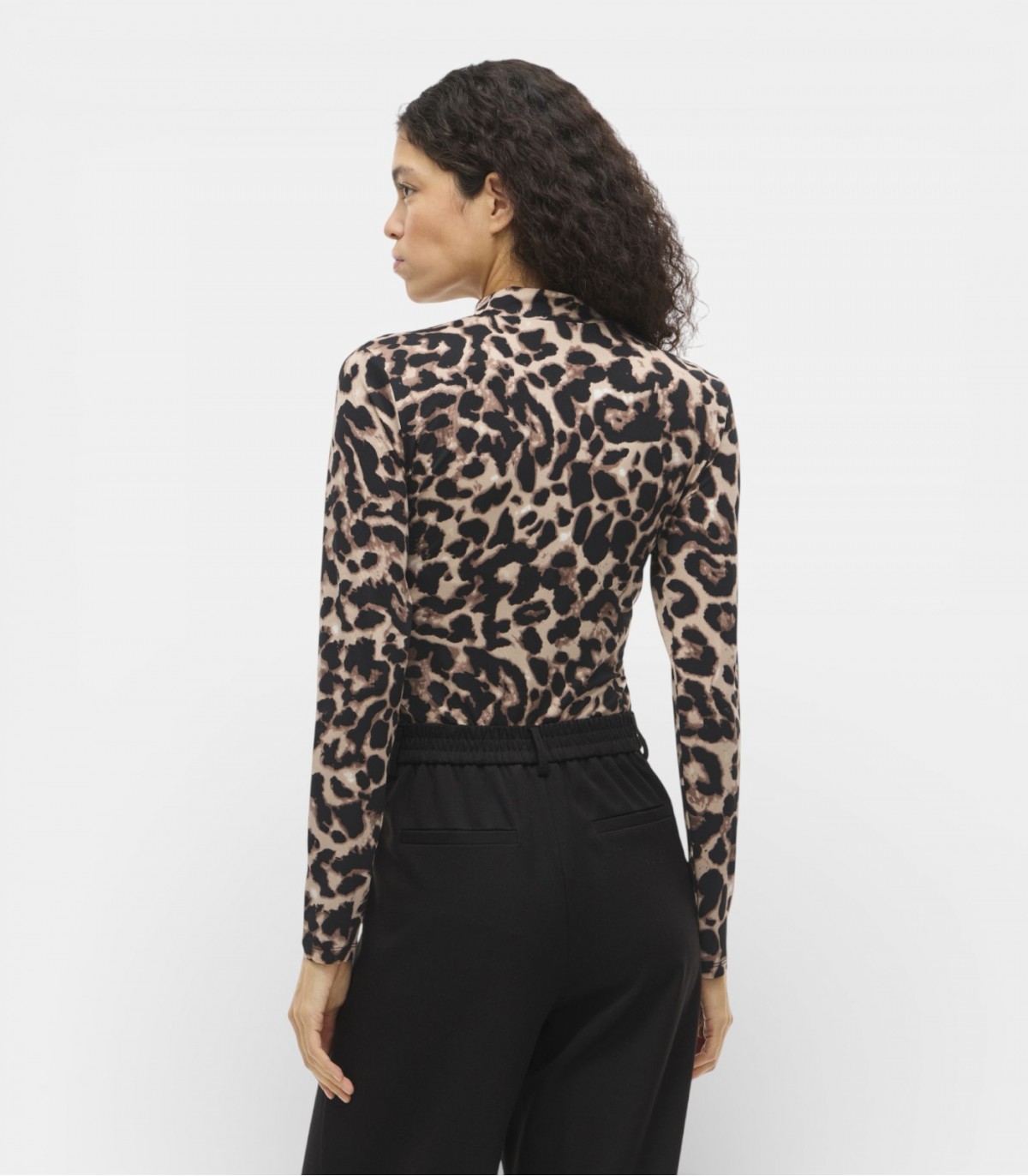Блузка с высоким воротом и длинными рукавами из легкого эластичного материала удобна для повседневной носки. Рисунок с изображением животных создает захватывающий образ и хорошо сочетается как с брюками, так и с юбками.